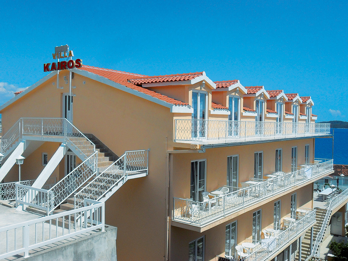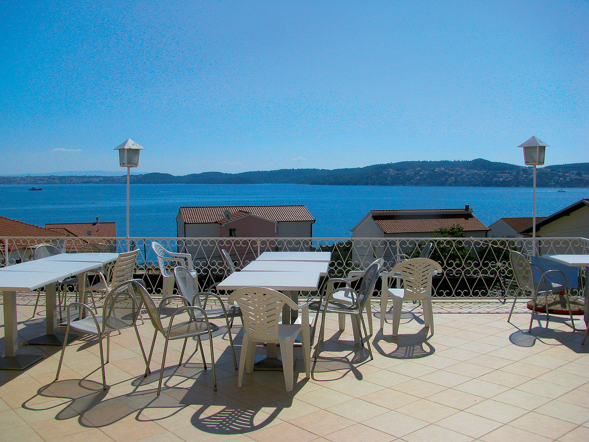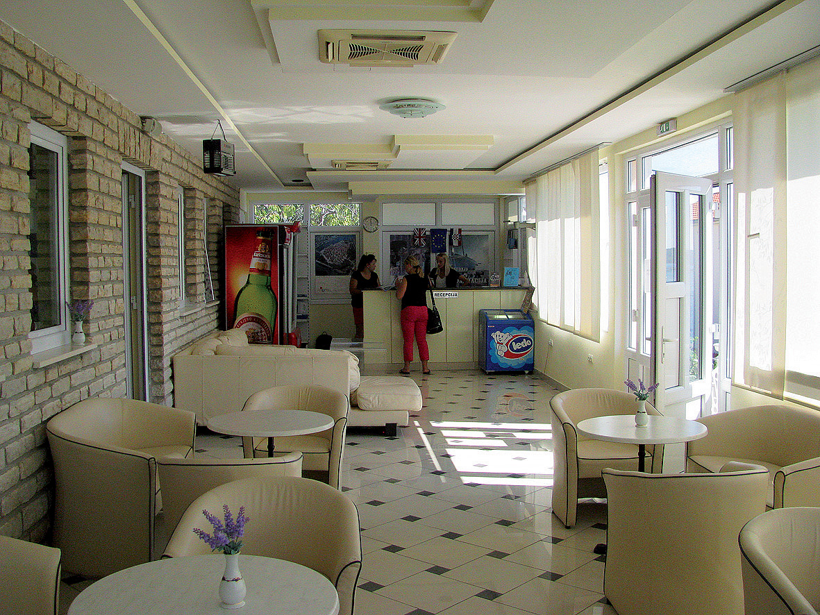 recepce / společenská místnost, velká společná terasa s výhledem na moře s posezením a slunečníky, vyhrazené parkoviště, wi-fi připojení k internetu
