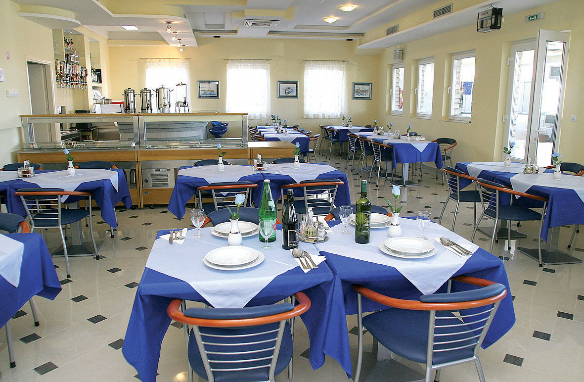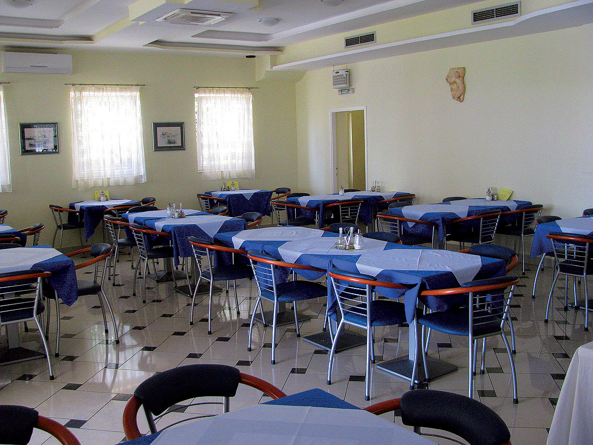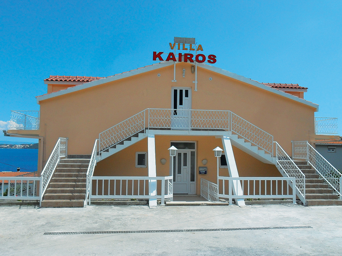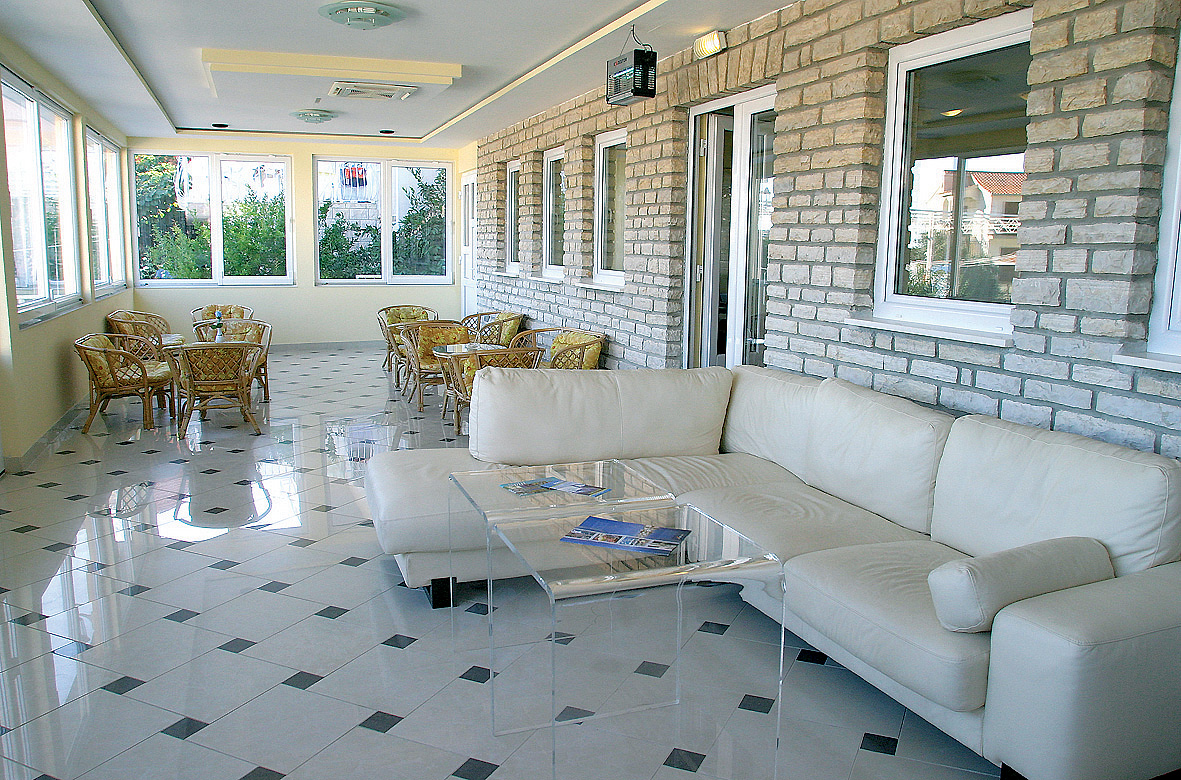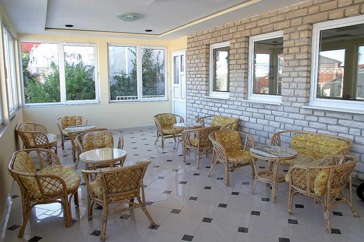 recepce / společenská místnost, částečně zastíněná velká společná terasa s výhledem na moře s posezením a slunečníky, vyhrazené parkoviště, wi-fi připojení k internetu