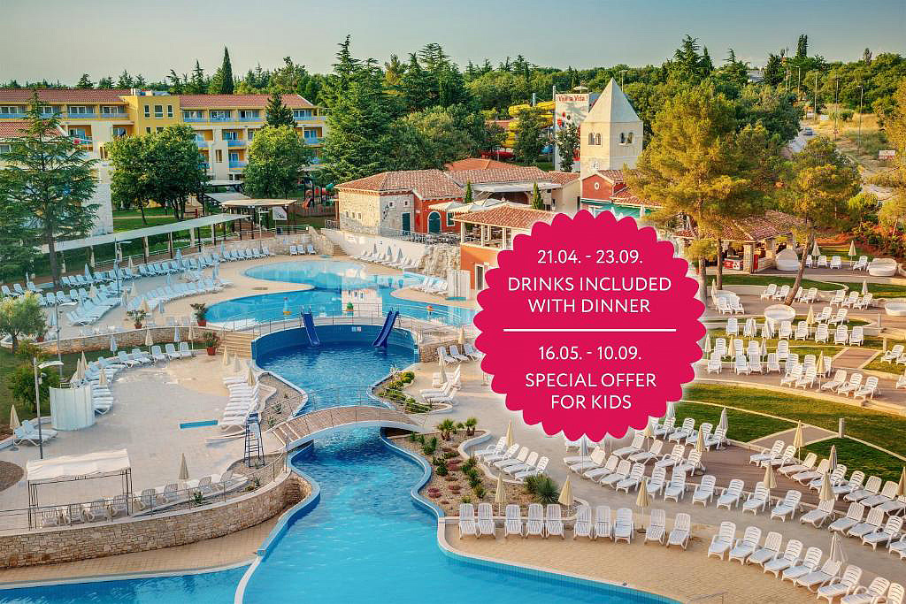 venkovní bazén s vodopády a vodními atrakcemi, úschovna kol, skluzavky (miniaquapark na rozloze 1100 m²), dětský bazén, wellness centrum - vnitřní bazén, whirlpool*, sauna* (turecká, 2x finská, solná), masáže*, fitness, tenisové kurty*, stolní tenis*, minigolf*, plážový volejbal*, hřiště pro míčové hry*, animace, vodní sporty*, jezdecké centrum*, půjčovna* a úschovna jízdních kol, turistický vláček (každých 30 min.) do města Umag;
