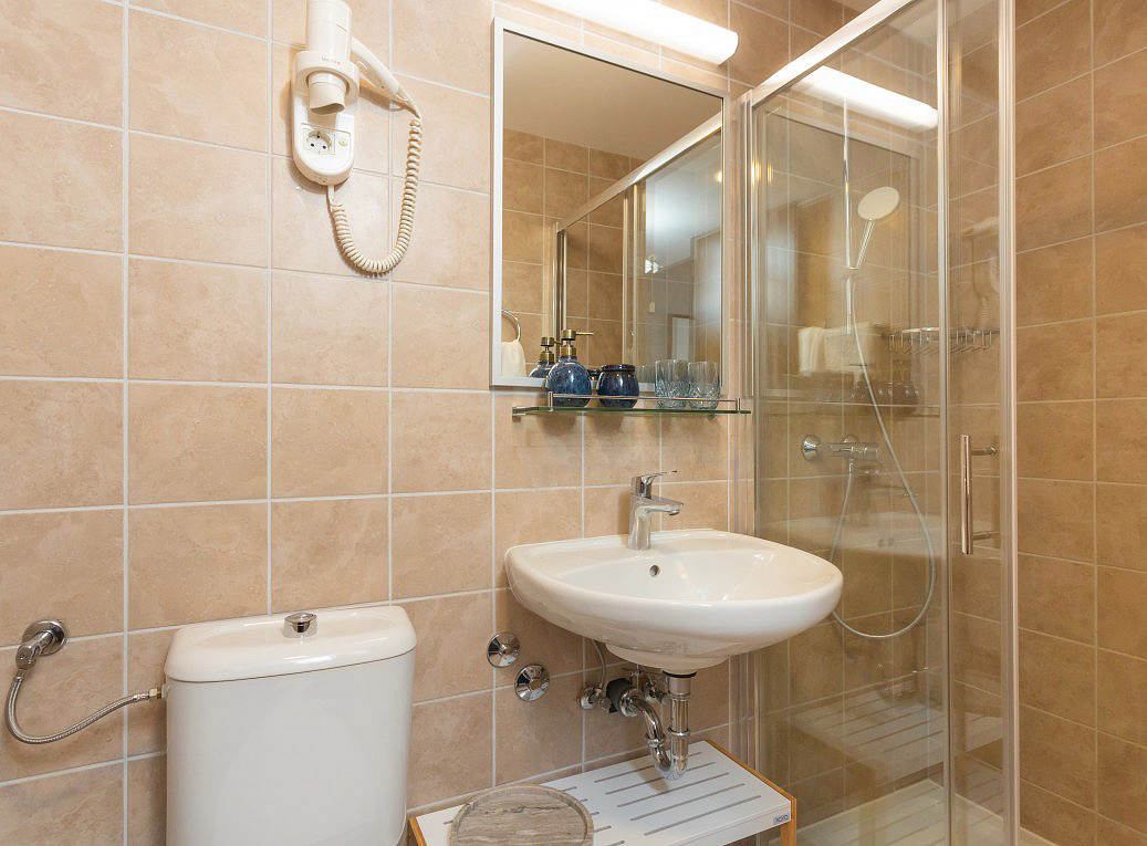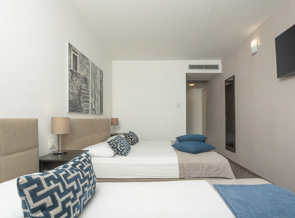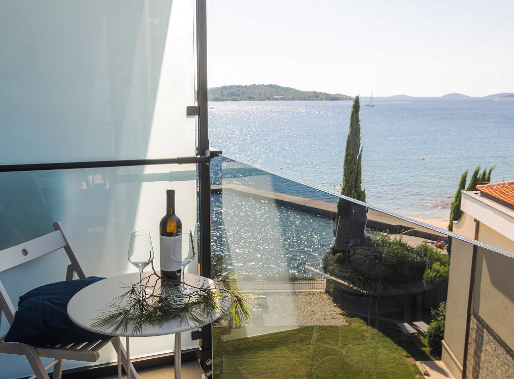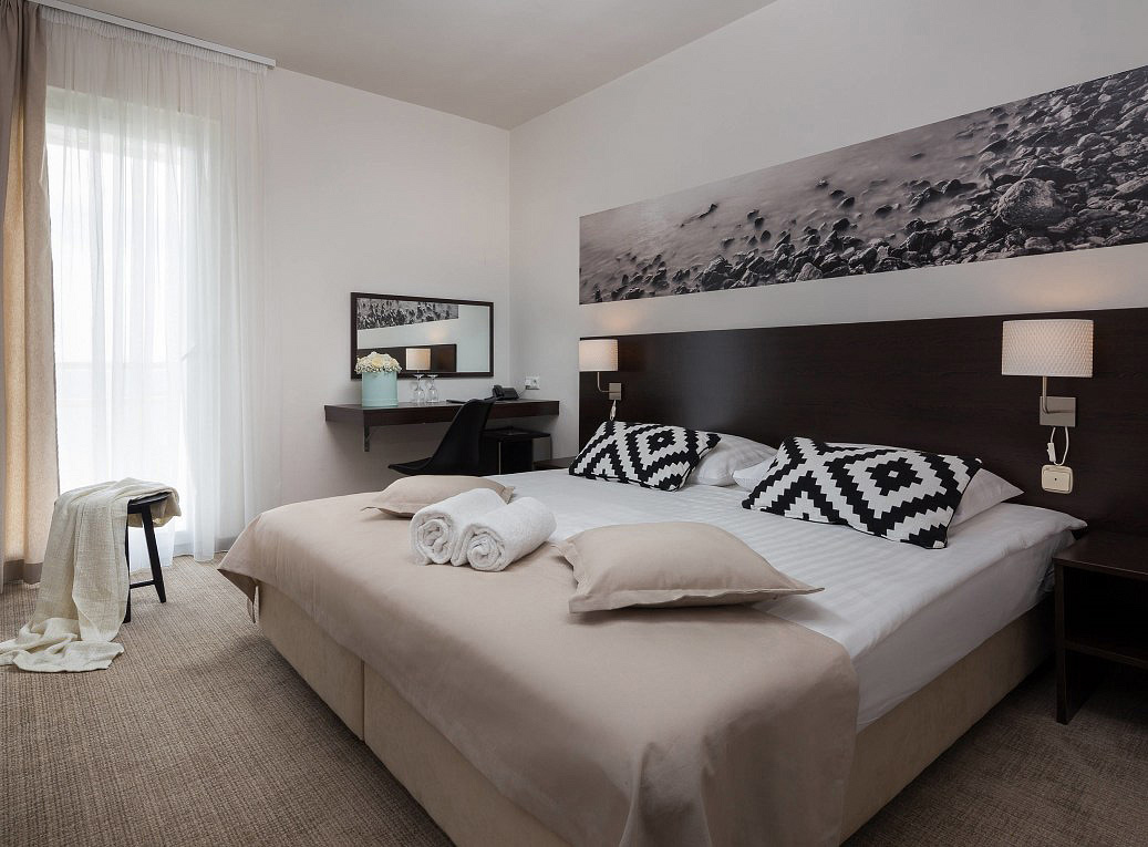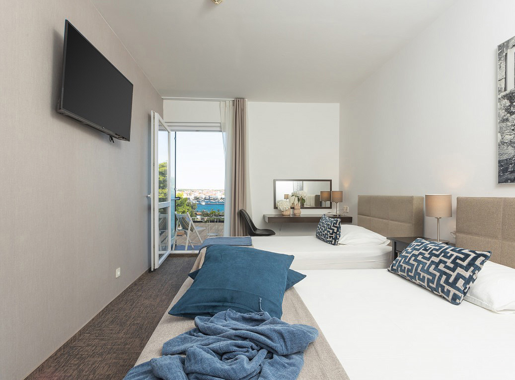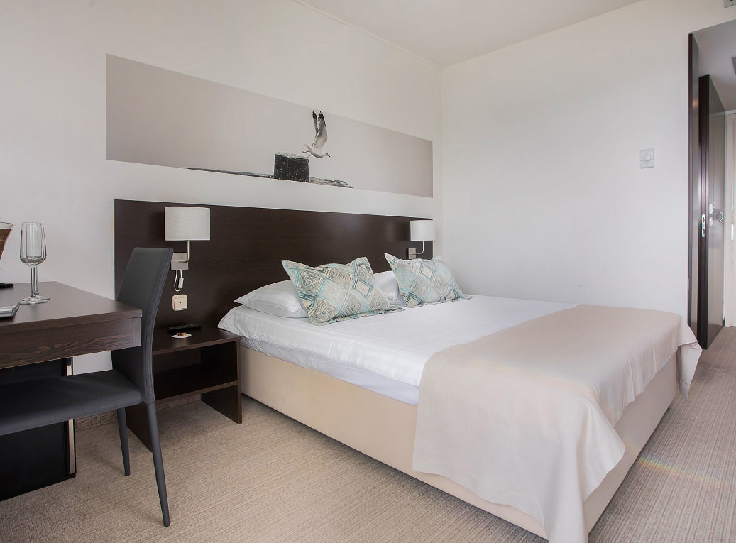 pokoj s manželskou postelí s možností přistýlky formou rozkládacího křesla, sociální zařízení se sprchou, balkon orientovaný k moři (sea side)