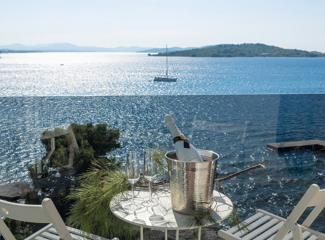 pokoj s manželskou postelí, sociální zařízení se sprchou, balkon s pohledem na moře (sea view)