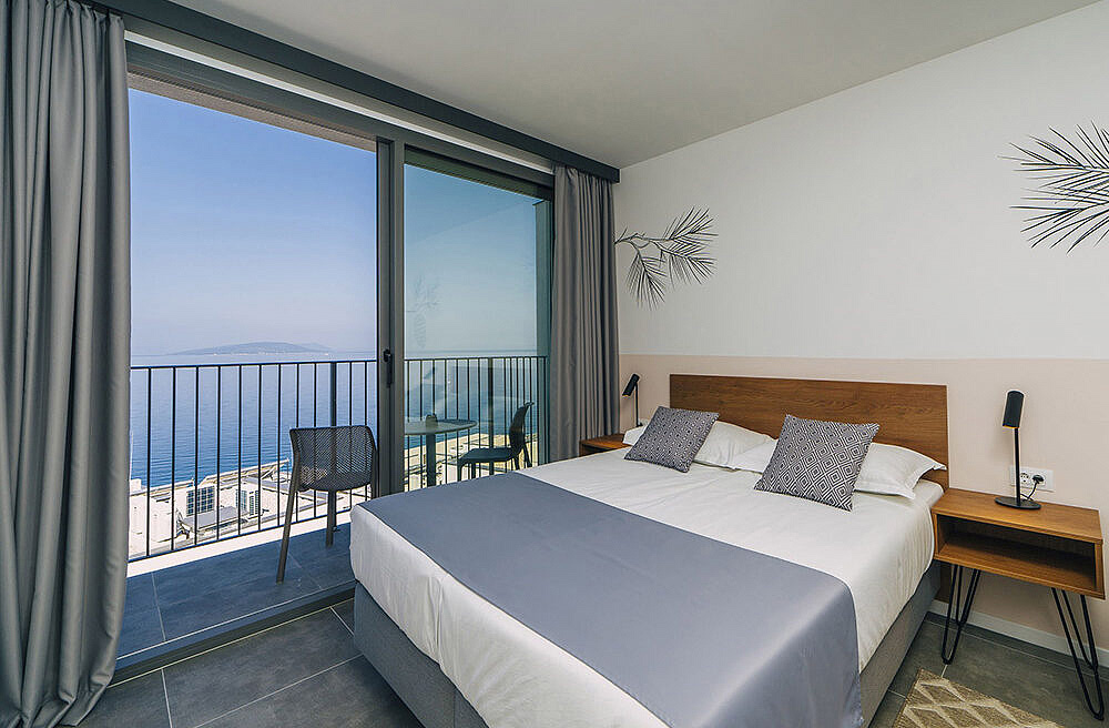 pokoj s manželskou postelí či 2 samostatnými lůžky s možností přistýlky formou rozkládacího křesla pro dítě do nedovršených 17 let, sociální zařízení se sprchou, balkon orientován na mořskou stranu