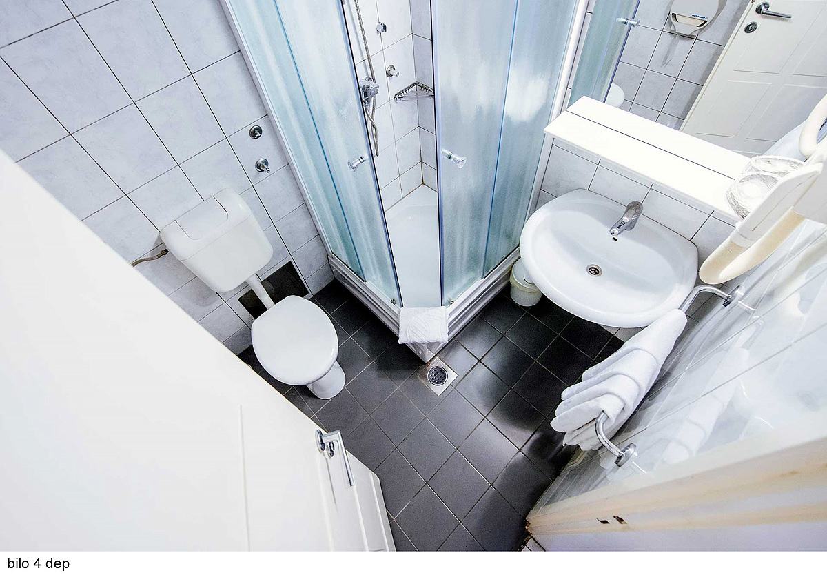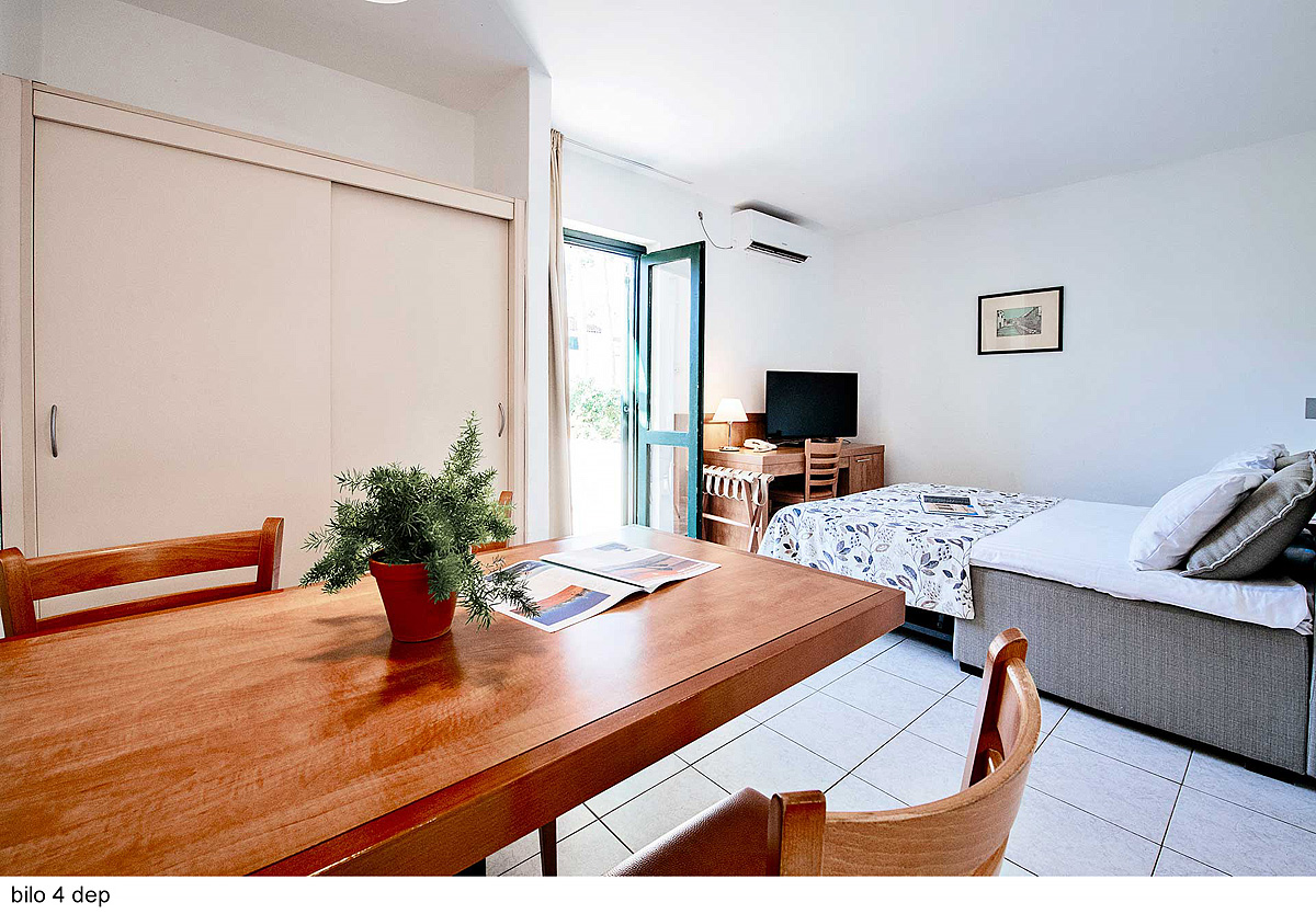 cca 20 m² - obývací pokoj s kuchyňským koutem a manželskou postelí nebo rozkládací pohovkou, sociální zařízení se sprchou, balkon nebo terasa