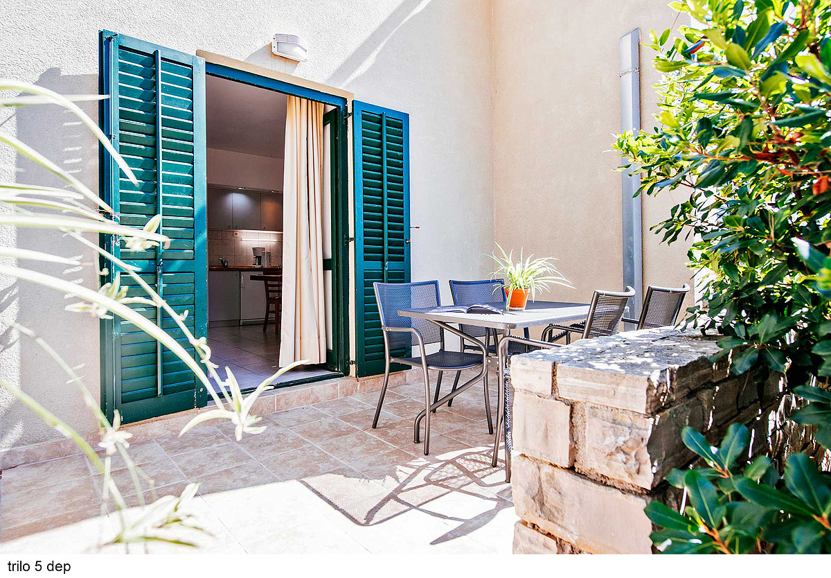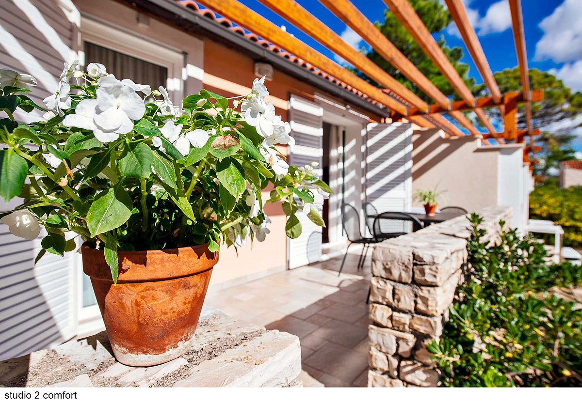 cca 43 m² - 1 ložnice s manželskou postelí, obývací pokoj s kuchyňským koutem a rozkládacím gaučem pro 2 dospělé osoby, sociální zařízení se sprchou, balkon nebo terasa (apartmán může být do patra nebo 1. podlaží)
