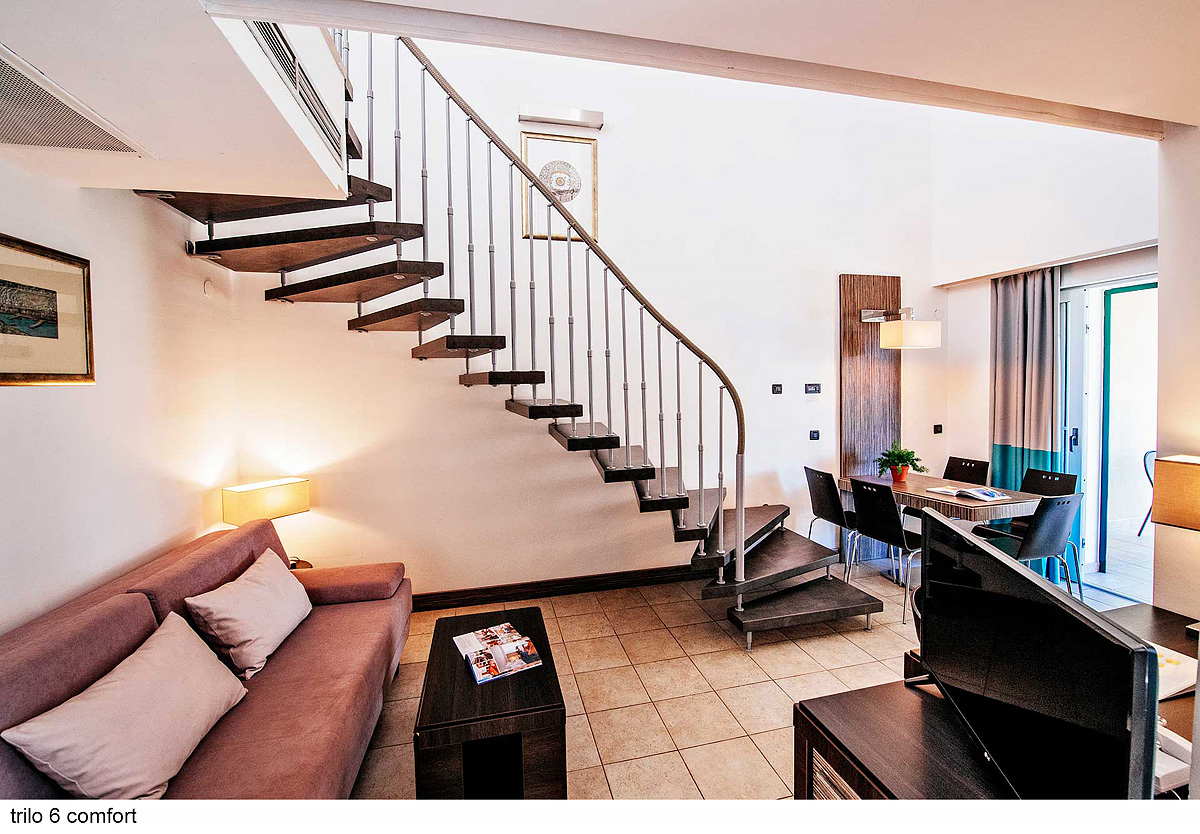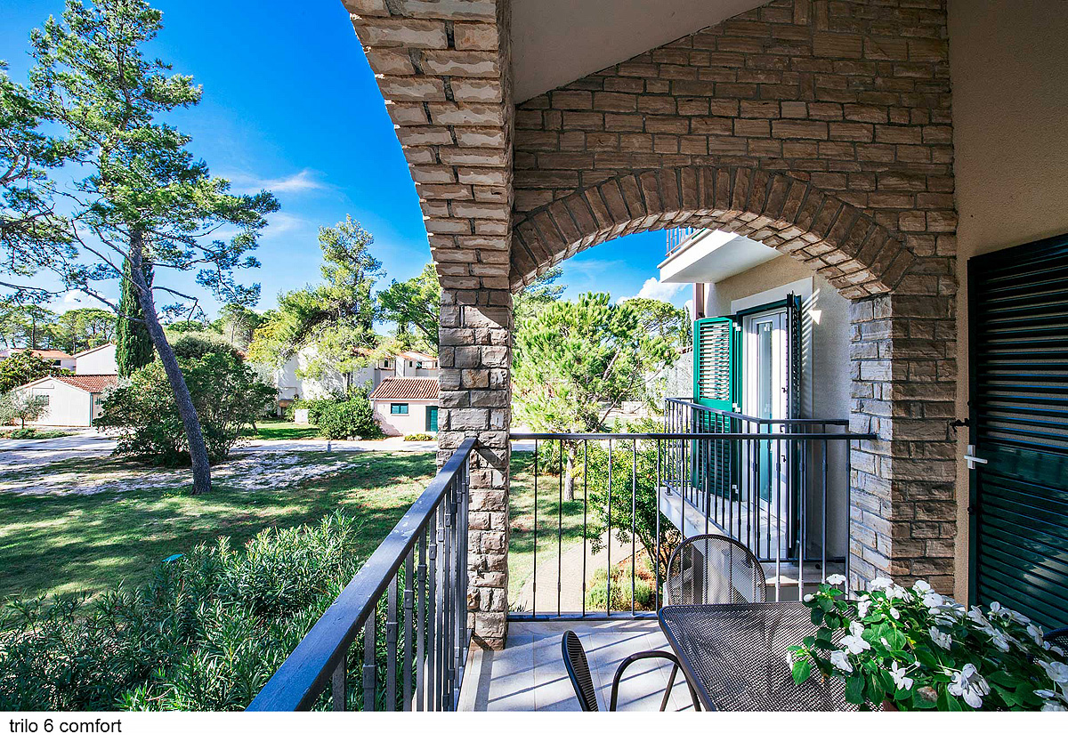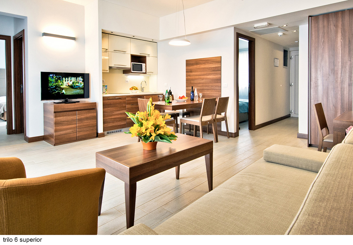 cca 64 m² - 1 ložnice s manželskou postelí, 1 ložnice s oddělenými lůžky, obývací pokoj s kuchyňským koutem a rozkládací gauč pro 2 dospělé osoby, 2x sociální zařízení, balkon nebo terasa (apartmán může být do patra nebo v 1. podlaží)