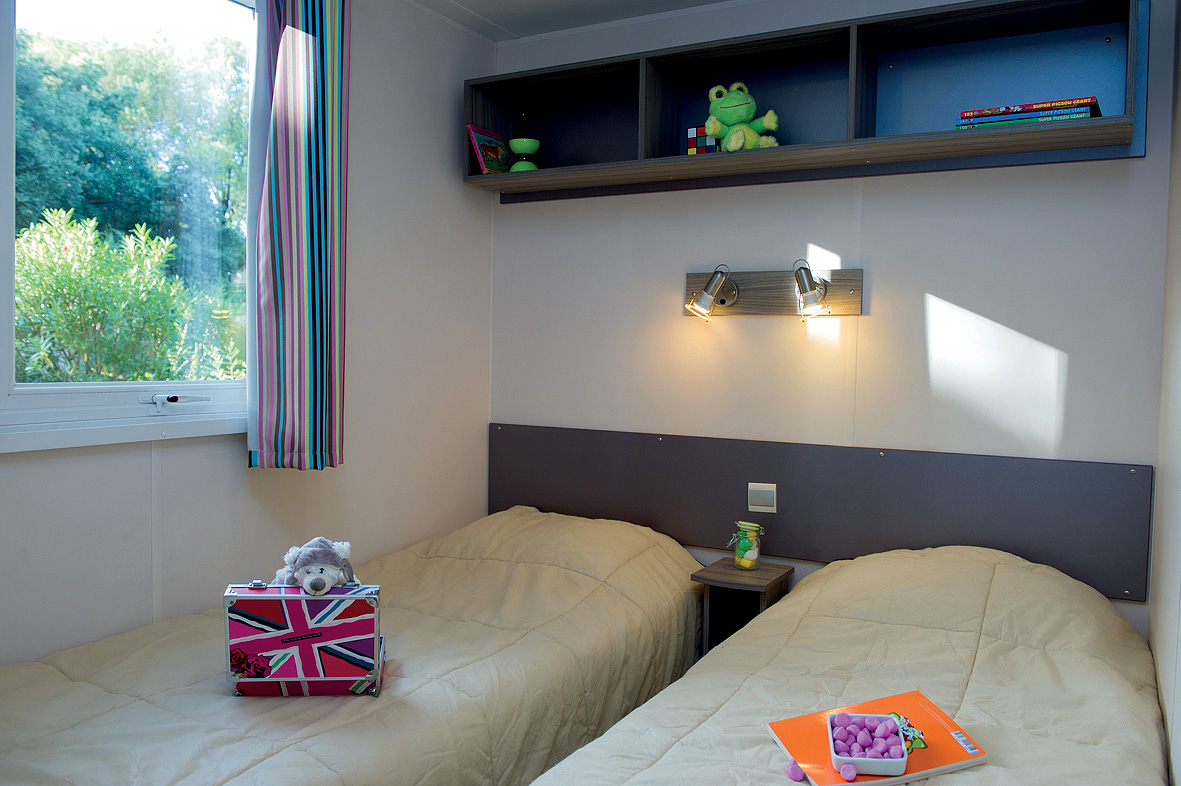 20 m² - 1 menší ložnice s manželskou postelí (140 cm x 190 cm), 1 menší ložnice s 2 samostatnými lůžky (80 cm x 190 cm), obývací pokoj s kuchyňským koutem a rozkládacím gaučem (130 cm x 190 cm) pro 2 osoby do 15 let, sociální zařízení se sprchou, menší částečně zastřešená integrovaná terasa 6,6 m² s posezením