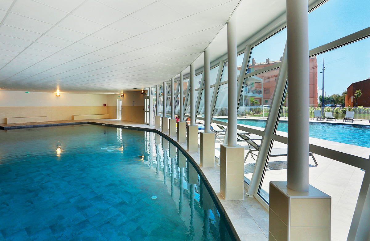 venkovní bazén nepravidelného tvaru s lehátky, vnitřní vyhřívaný bazén nepravidelného tvaru, sauna, vířivka, posilovna, masáže*, stolní tenis