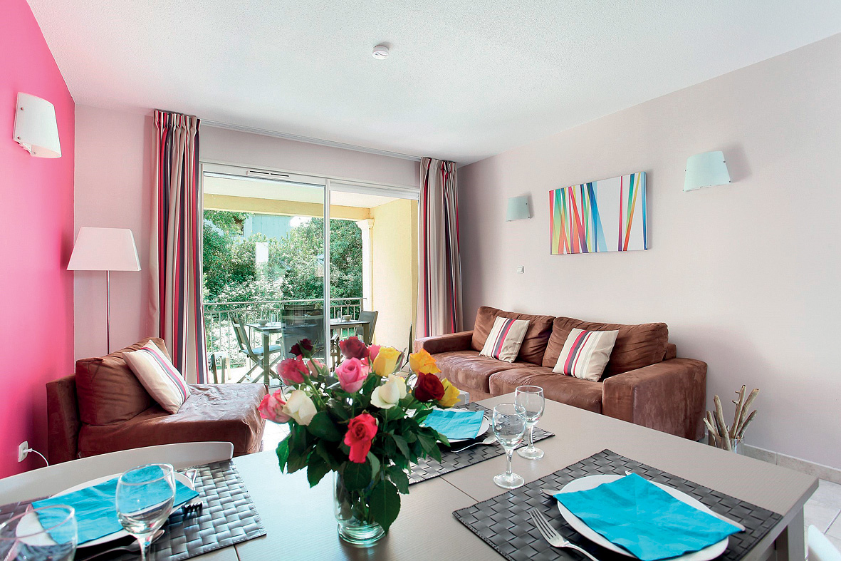 38 m² - 1 ložnice s manželskou postelí, obývací pokoj s kuchyňským koutem a rozkládacím gaučem pro 2 osoby (možno i typ "šuplík") a 1 samostatné lůžko ve formě rozkládacího křesla (190 x 80 cm), sociální zařízení se sprchou, terasa (16 m²)