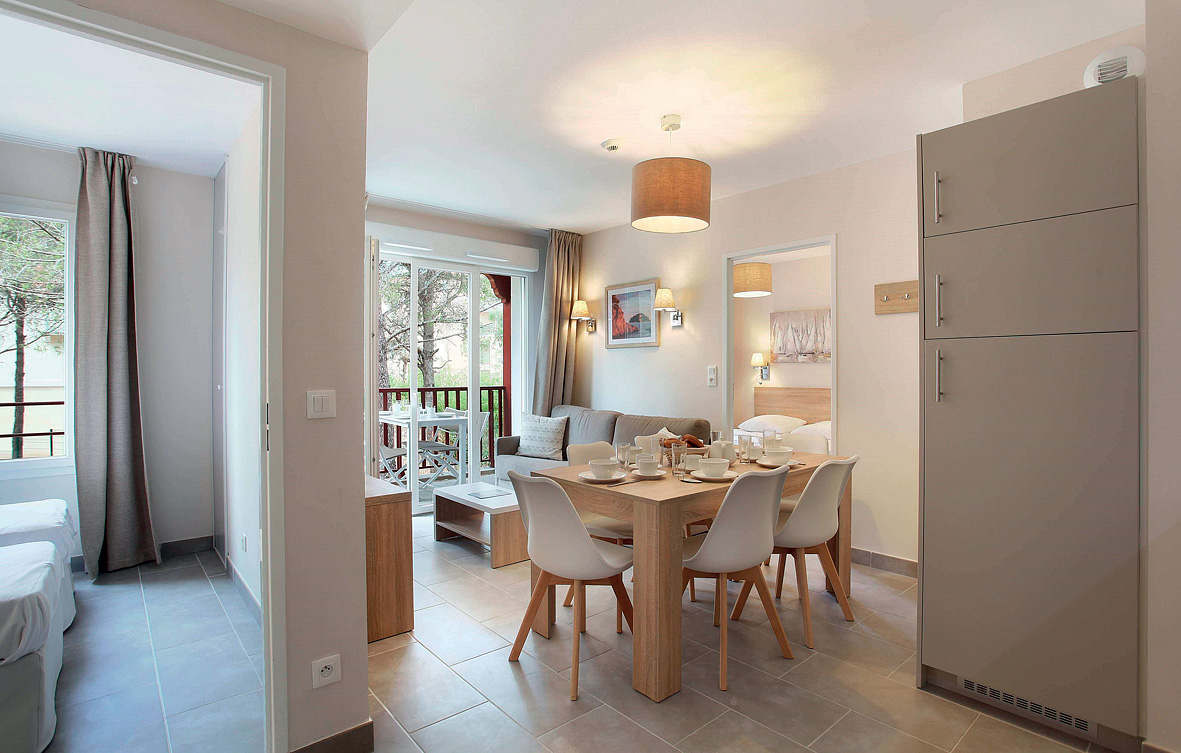 28 m² - 1 ložnice s manželskou postelí či s oddělitelnými lůžky, obývací pokoj s kuchyňským koutem a rozkládacím gaučem pro 2 osoby (možno i typ "šuplík"), sociální zařízení se sprchou, terasa či balkon