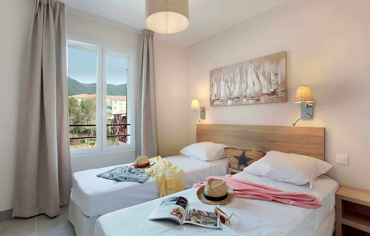40 m² - 1 ložnice s manželskou postelí, 1 ložnice s 2 oddělitelnými lůžky, obývací pokoj s kuchyňským koutem a rozkládacím gaučem pro 2 osoby (možno i typ "šuplík"), 2 sociální zařízení se sprchou či vanou, terasa či balkon
