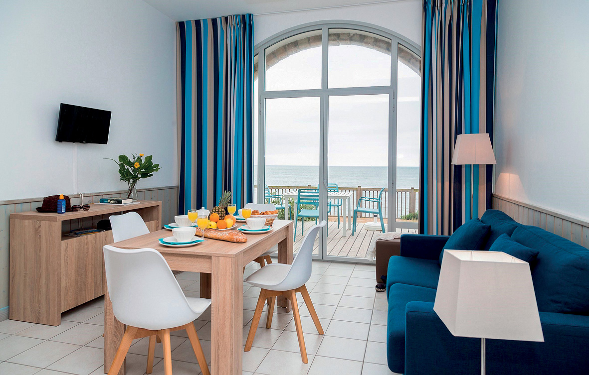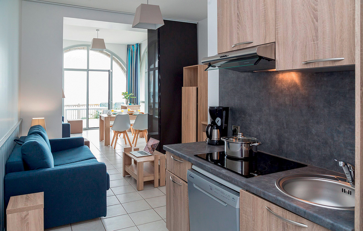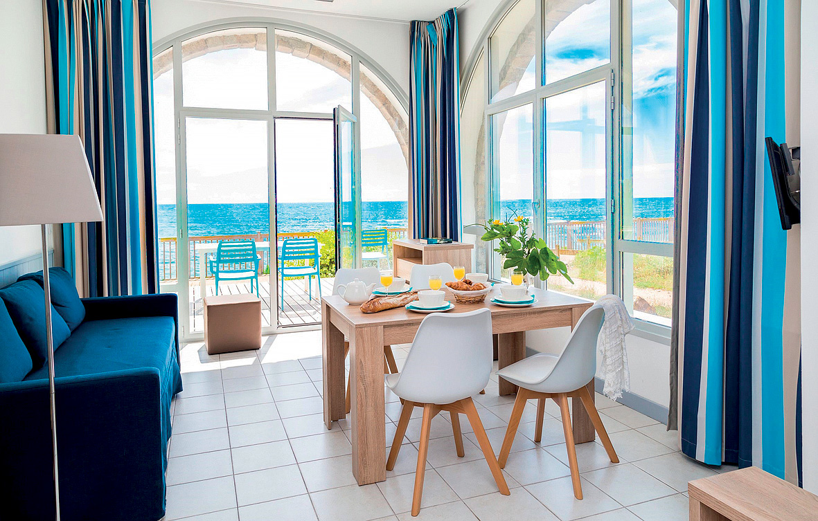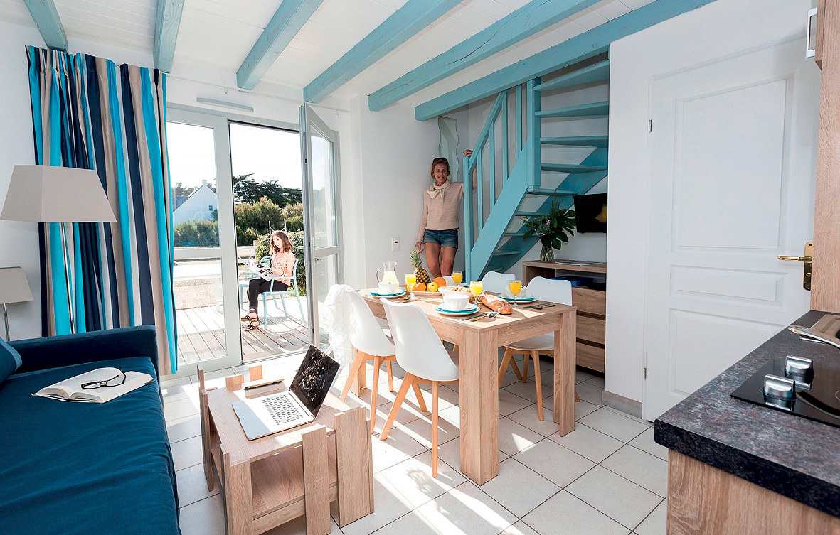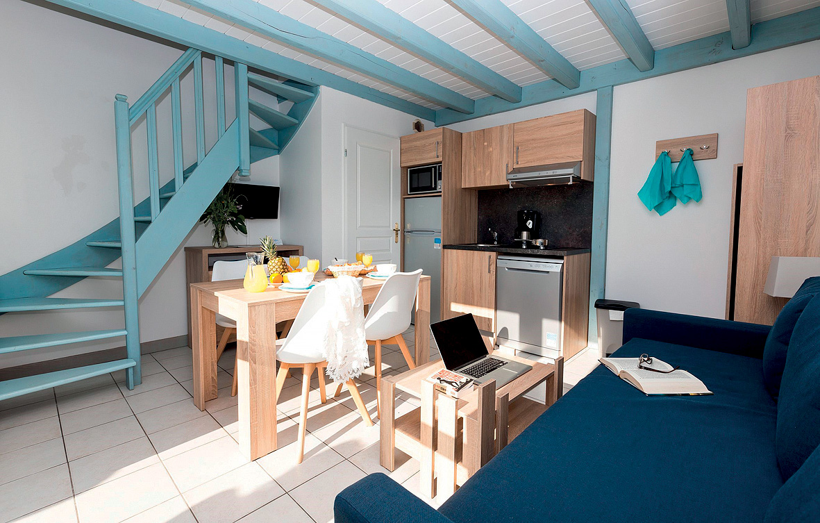 studio 4 - 25 m² - obývací pokoj s kuchyňským koutem a rozkládacím gaučem pro 2 osoby (možno i typ "šuplík") a zvýšené neuzavřené patro s manželskou postelí v rámci obývacího pokoje či kabina / vstupní místnost s palandou či varianta obývací pokoj s kuchyňským koutem a 2 rozkládacími gauči pro 2 osoby (možno i typ "šuplík"), sociální zařízení; orientace k moři