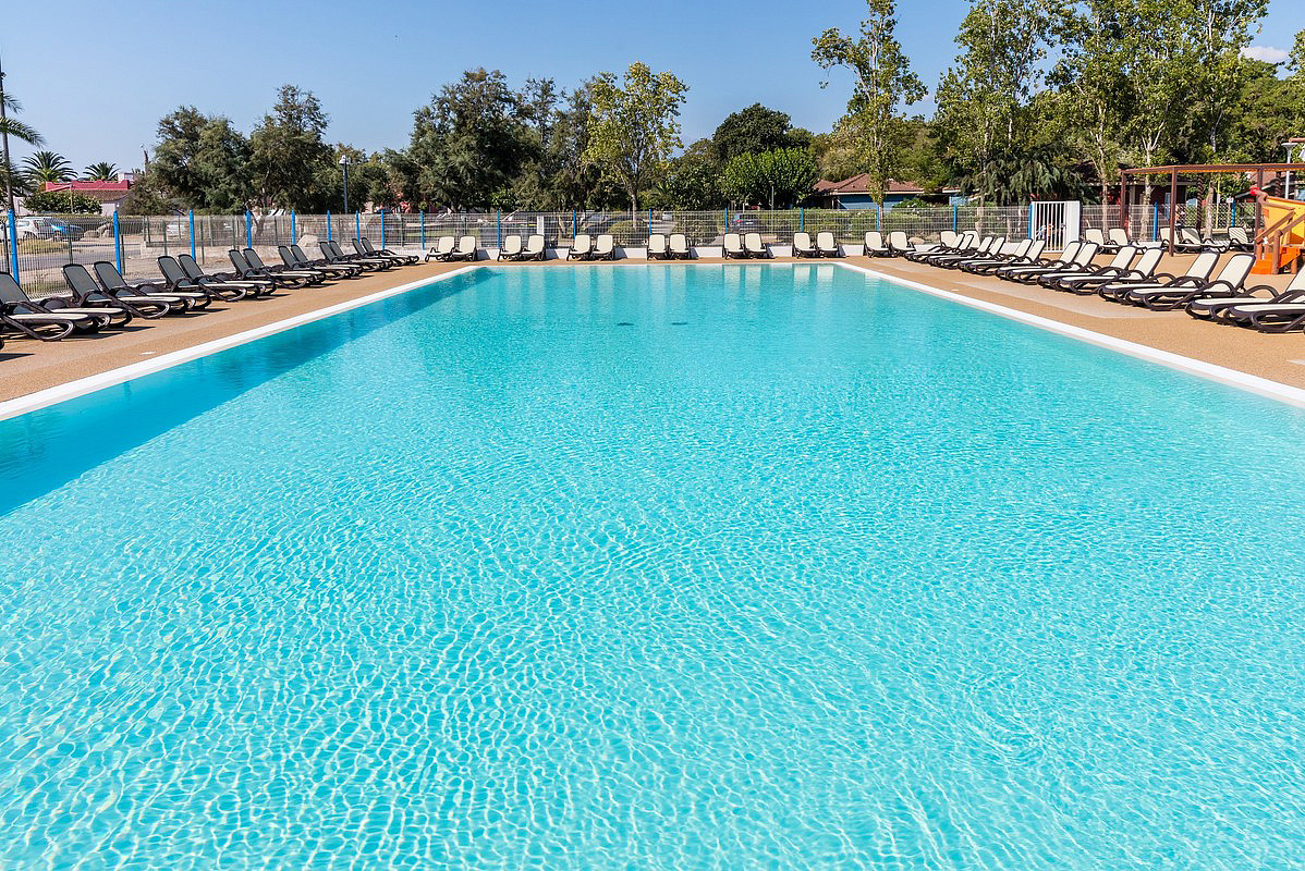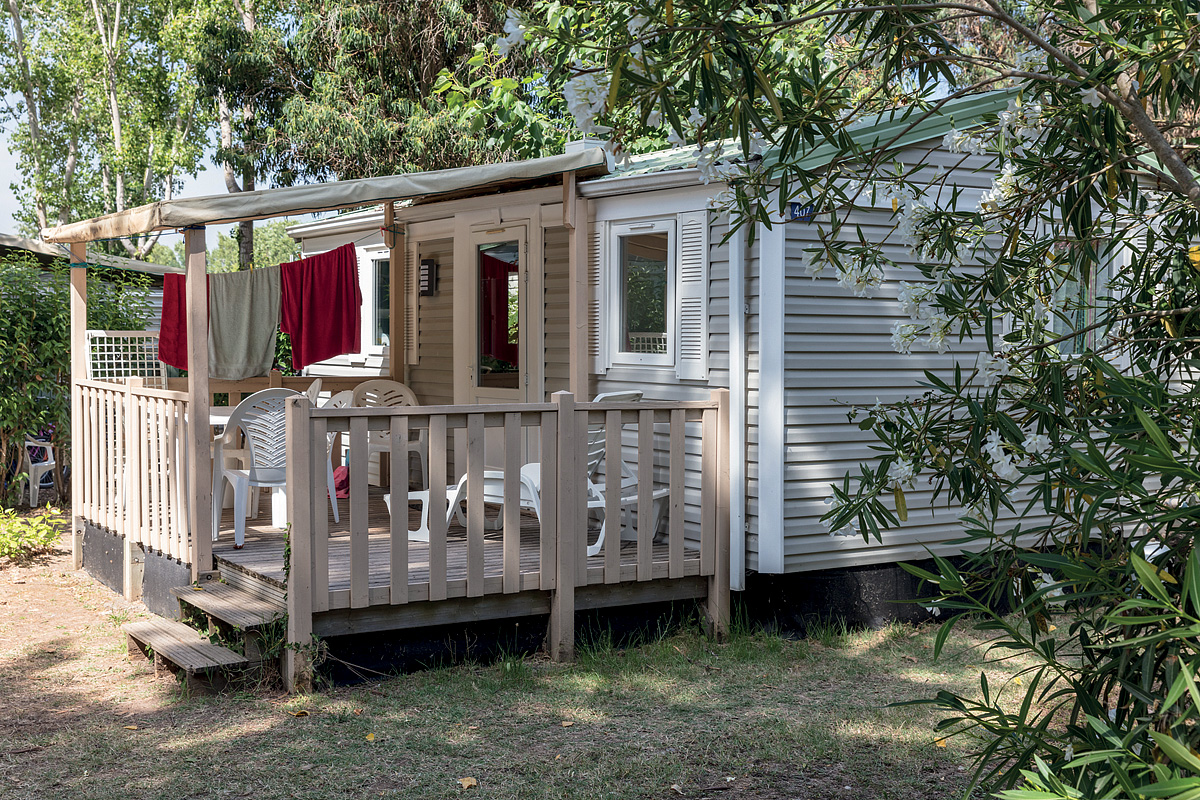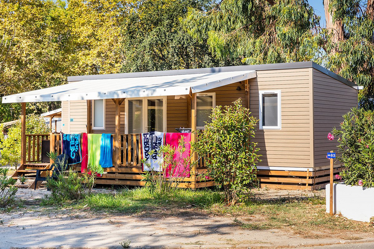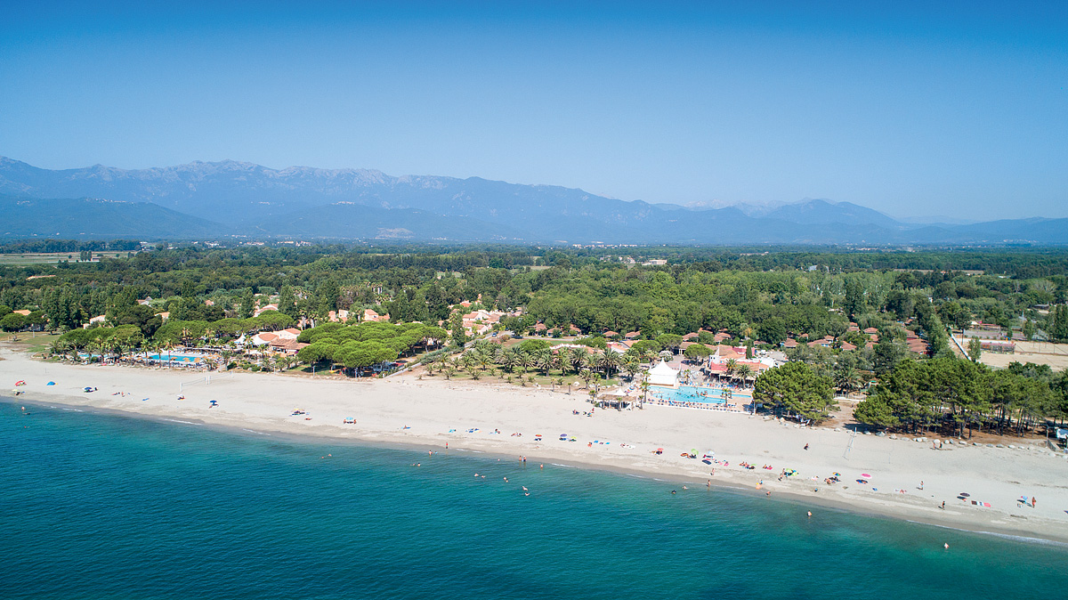 mobilní domky a bungalovy v rámci rozsáhlého kempu s širokou vybaveností rozkládajícího se podél dlouhé písečné pláže