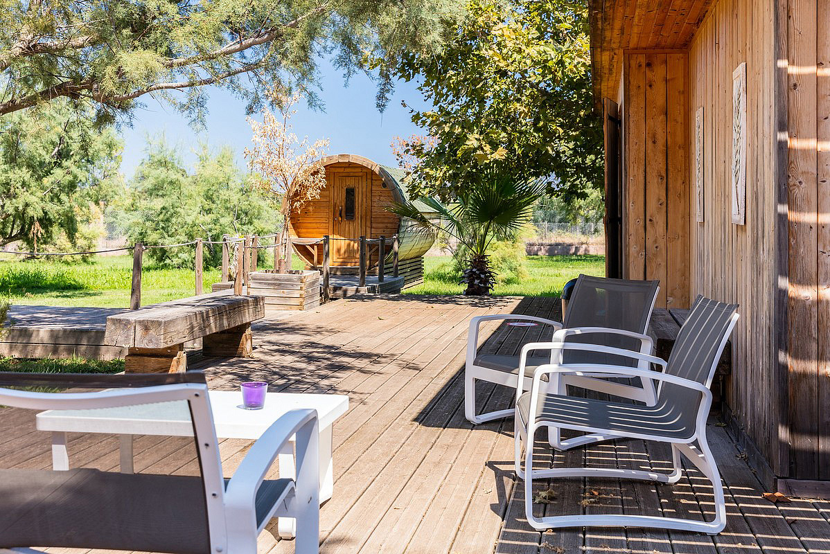 20 m² - 1 menší ložnice s manželskou postelí (140 x 190 cm), 1 menší ložnice se 2 samostatnými lůžky (70 x 190 cm), obývací pokoj s kuchyňským koutem a gaučem, sociální zařízení se sprchou, menší terasa s posezením (12 m²)