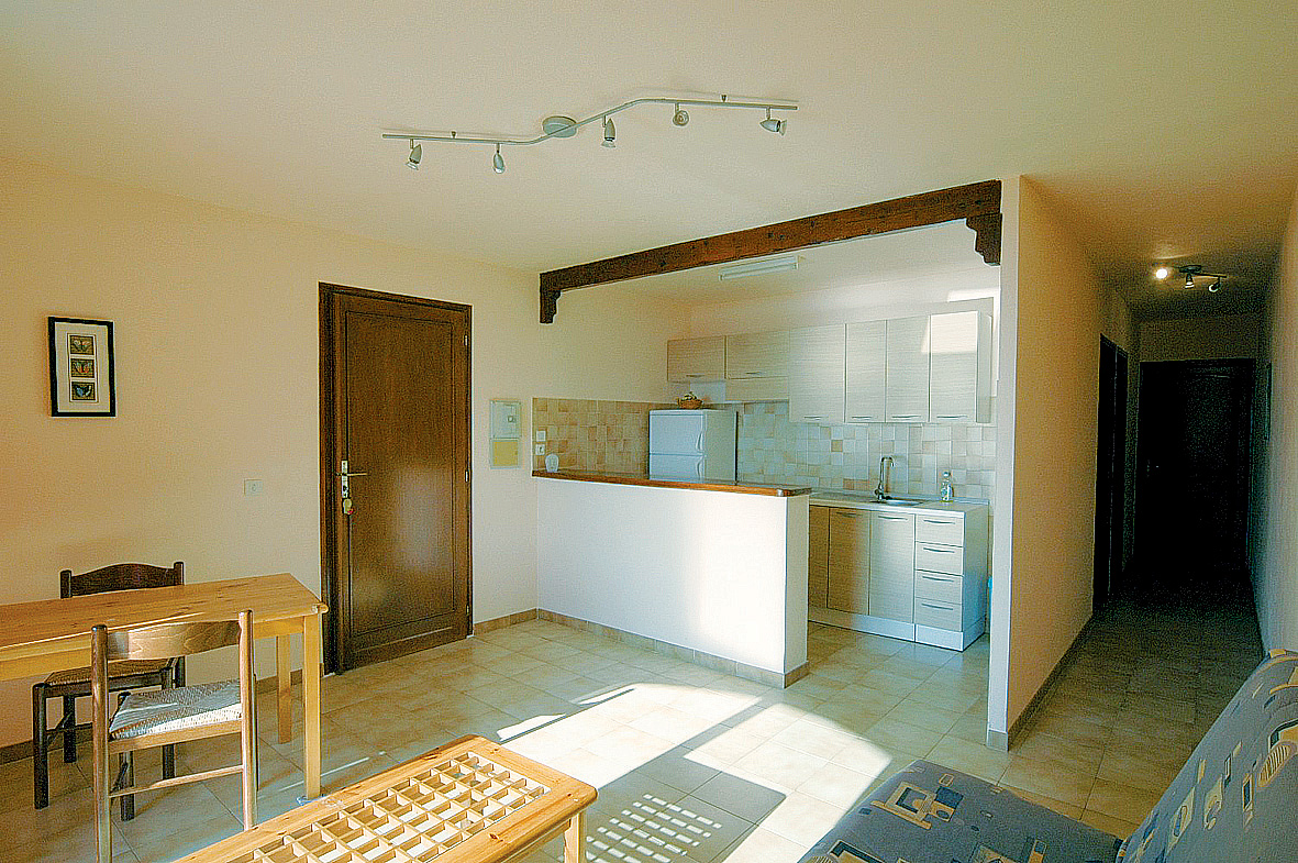 57 m² - 1 ložnice s manželskou postelí, 1 ložnice s manželskou postelí či palandou, obývací pokoj s částečně odděleným kuchyňským koutem a rozkládacím gaučem pro 2 osoby o velikosti 1,5 běžného lůžka, sociální zařízení se sprchou, balkon