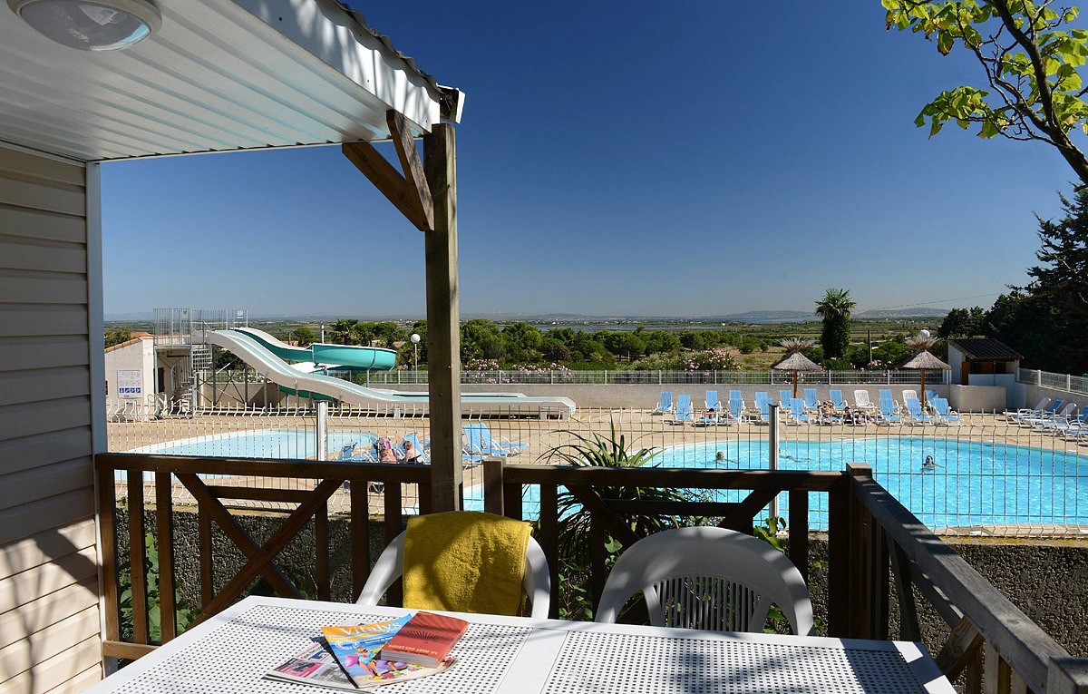Kemp s výhledem na pohoří Cévennes, u jezera de Thau nebo přístavního města Sète, na klidném místě obklopeném zelení, ale především v blízkosti dynamického letoviska Cap d'Agde a jeho 14 km pláží, mobilní domky s terasou, na místě, mimo sezónu, vyhřívaný, venkovní bazén se skluzavkou, sezónní sportovní a společenské akce pro celou rodinu.