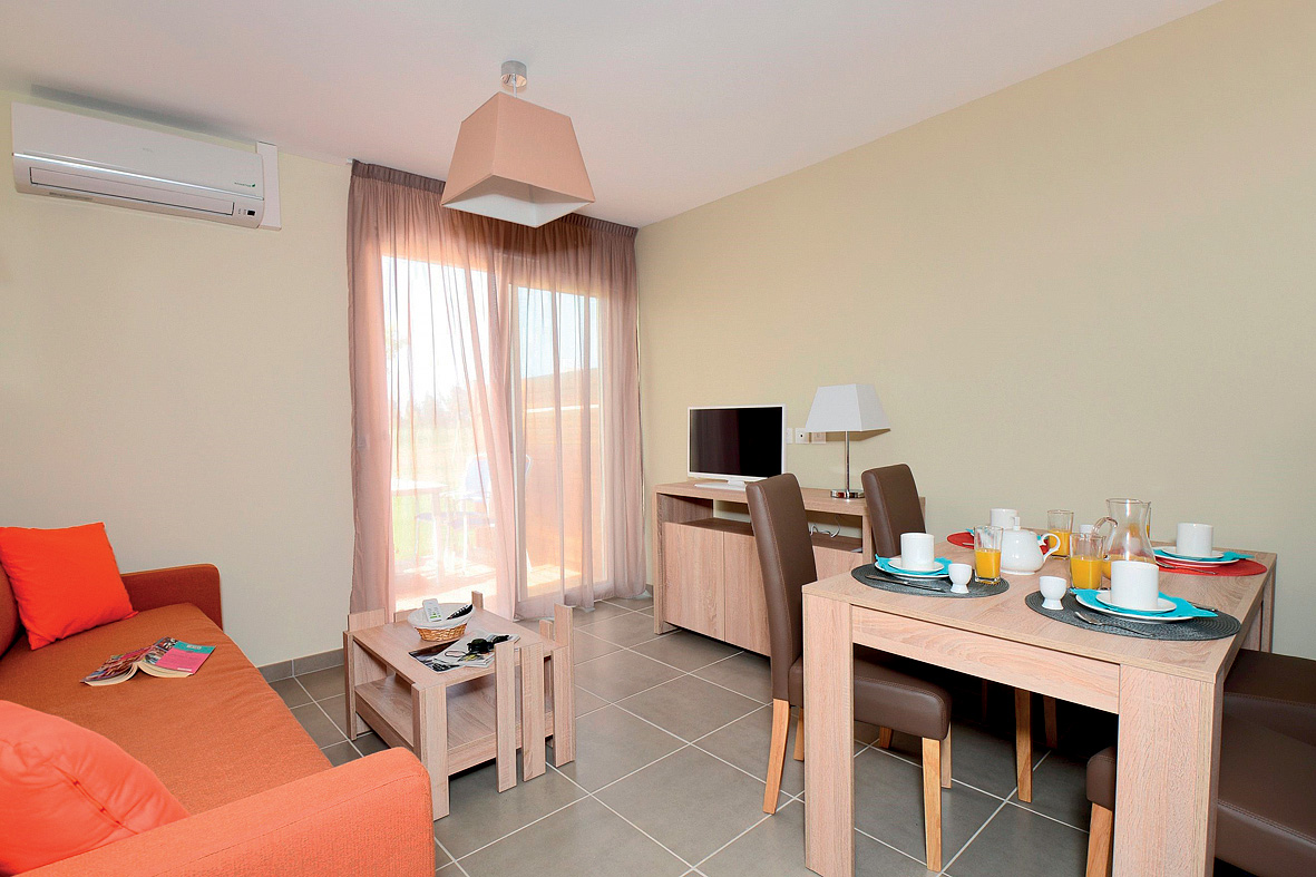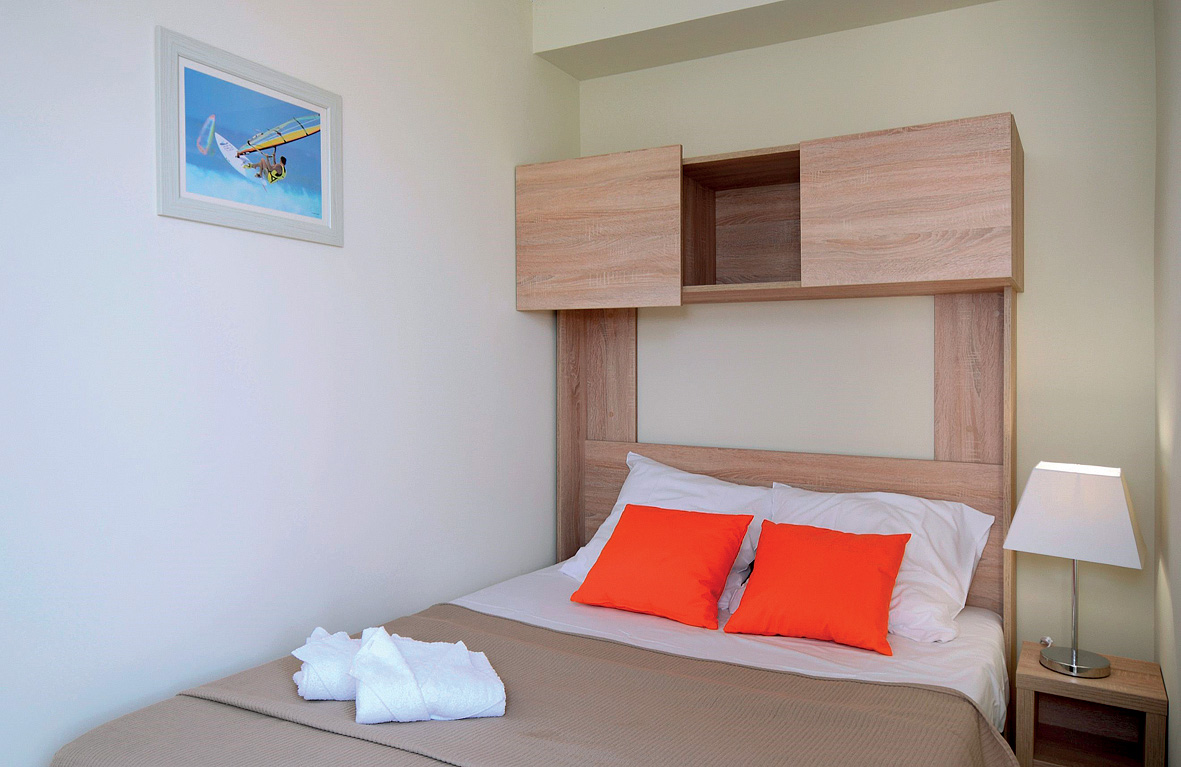 60 m² - 1 ložnice s manželskou postelí, obývací pokoj s kuchyňským koutem a rozkládacím gaučem pro 2 osoby (možno i typ "šuplík"), oddělený spací kout s manželskou postelí či palandou, sociální zařízení se sprchou, terasa s posezením