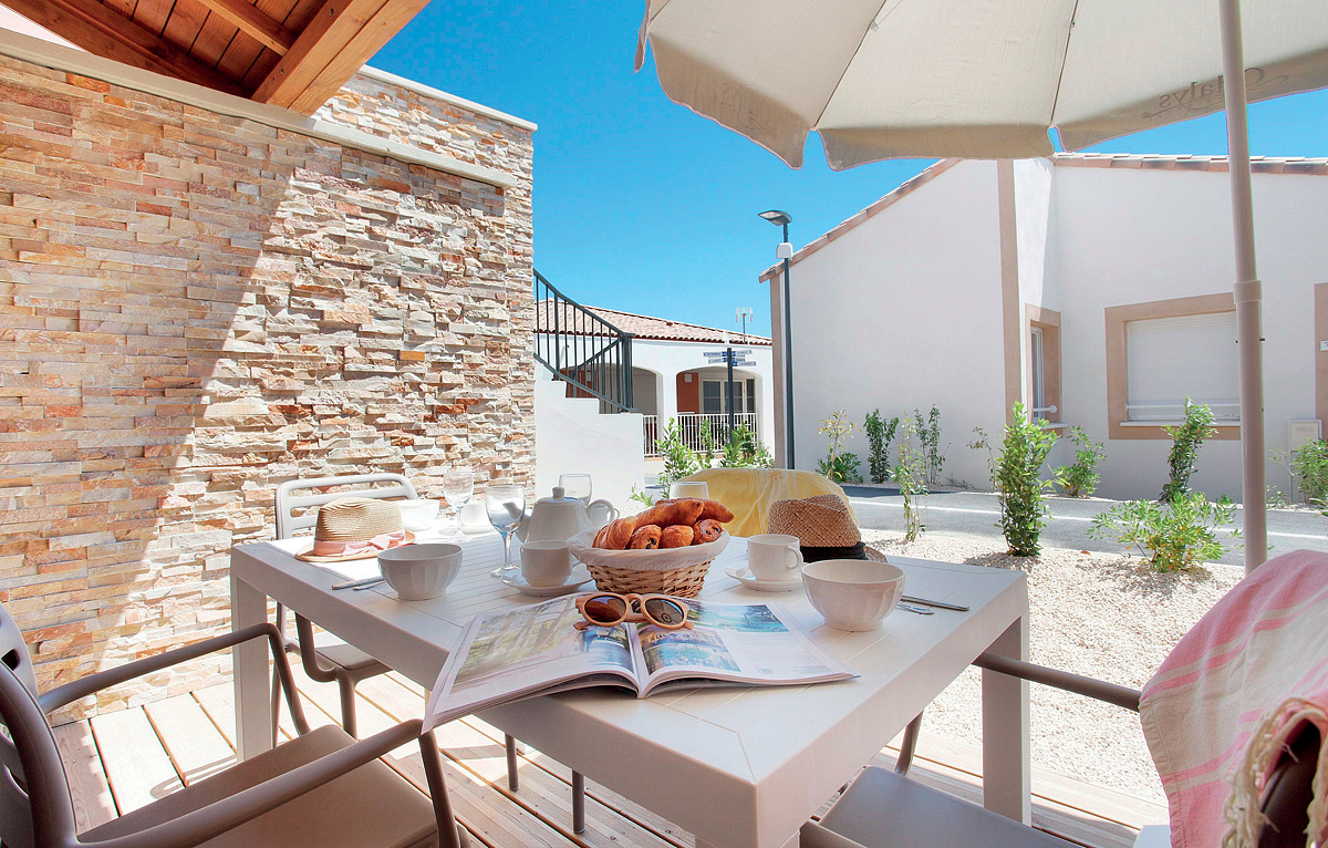 44 m² - 1 ložnice s manželskou postelí, kabina či vstupní místnost s palandou, obývací pokoj s kuchyňským koutem a rozkládacím gaučem pro 2 osoby (možno i typ "šuplík"), sociální zařízení se sprchou či vanou, balkon či terasa s posezením; některé apartmány mohou být dvoupodlažní
