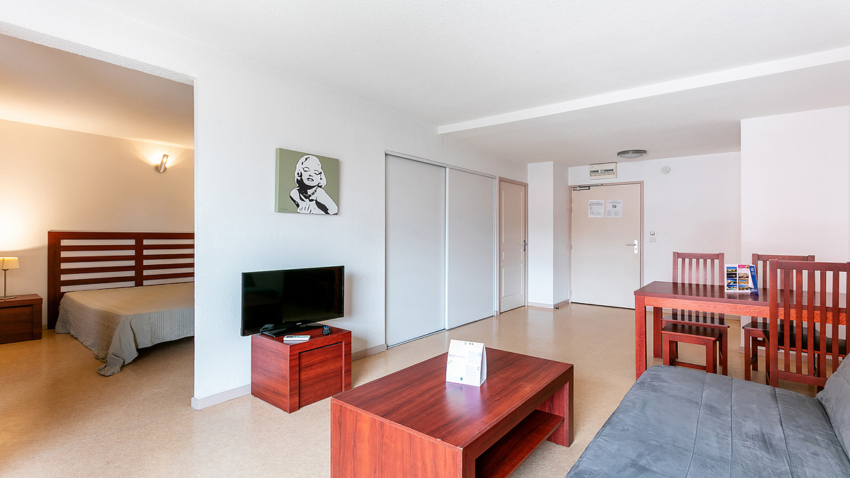 19 m² - obývací pokoj s kuchyňským koutem a rozkládacím gaučem pro 2 osoby (možno i typ "šuplík"), sociální zařízení se sprchou či vanou, balkon S VÝHLEDEM NA BAZÉN