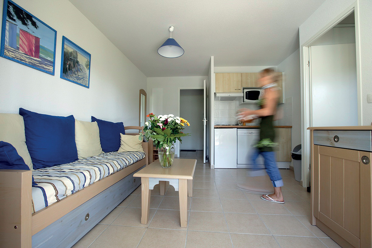 30 m² - 1 ložnice s manželskou postelí, obývací pokoj s kuchyňským koutem a rozkládacím gaučem pro 2 osoby (možno i typ "šuplík"), sociální zařízení s vanou, balkon či terasa