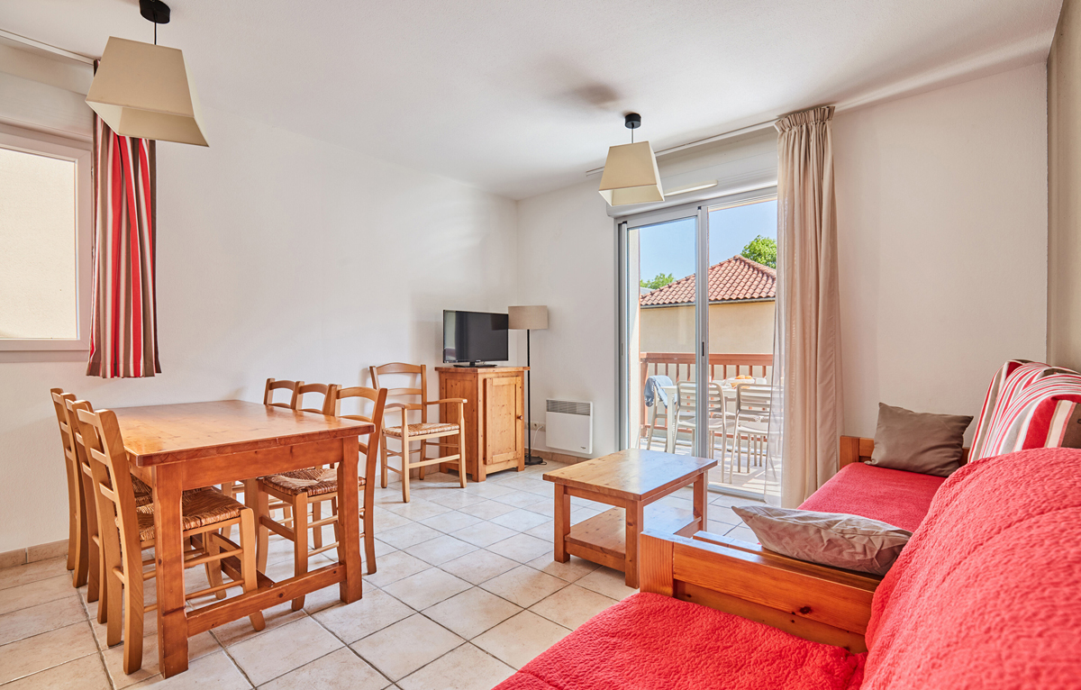 35 m² – 1 ložnice s manželskou postelí, kabina s palandou, obývací pokoj s kuchyňským koutem a rozkládacím gaučem (typ šuplík), koupelna, oddělené WC; apartmány jsou dvoupodlažní