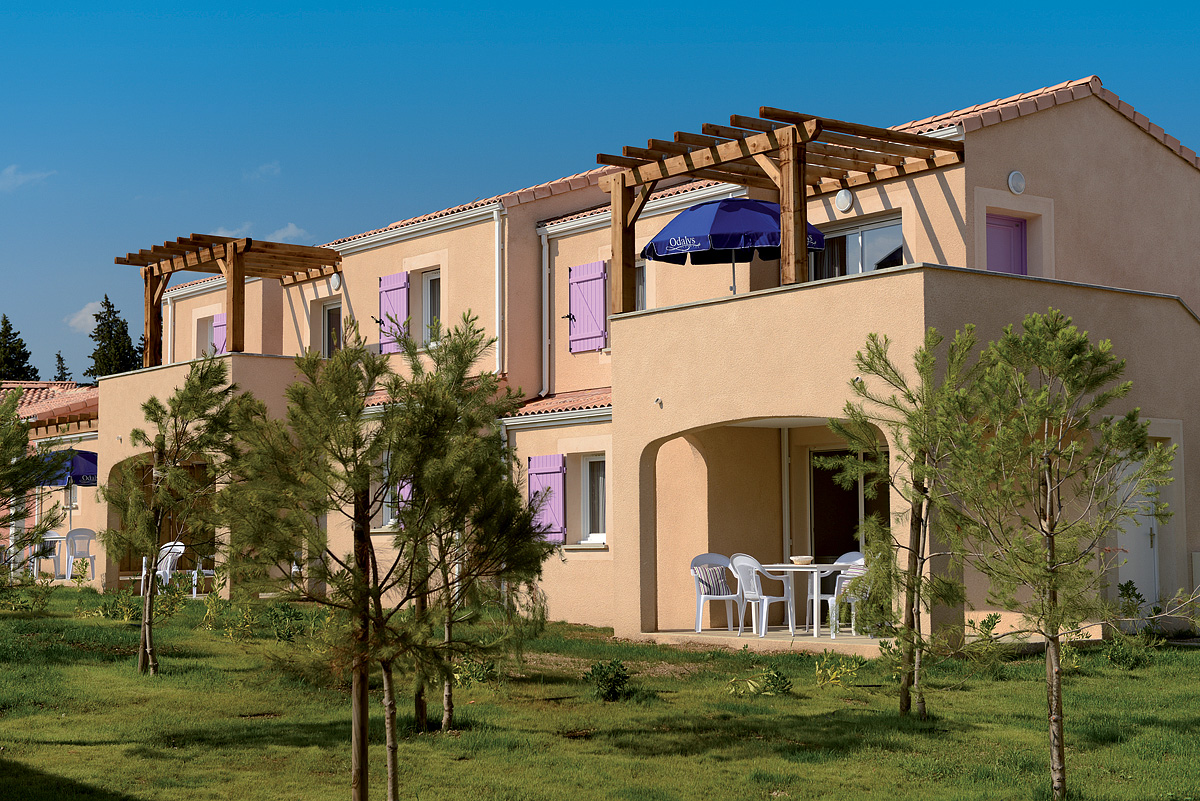 komplex patrových řadových domků soustředěných okolo hlavní budovy s recepcí a bazénu s tobogánem