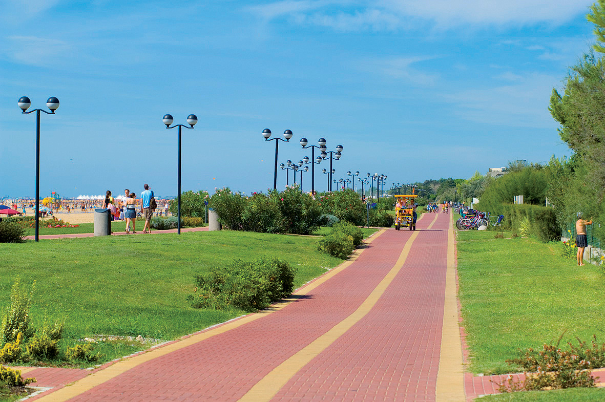 O pár řádek výše jsme zmínili zkvalitňující se infrastrukturu. Ta je zde dnes tak široká, že obdobných letovisek je v tomto ohledu opravdu hodně poskrovnu. Nesčetné obchody včetně značkových butiků, široký výběr restaurací s typickou italskou i mezinárodní kuchyní, bary, herny, diskotéky, široké sportovní zázemí, ale především bujarý večerní život s hlavní promenádou měnící se každodenně v korzující lidské mraveniště, to je ten typický obrázek letního Bibione. Nikdo z rekreantů si zpravidla nenechá ujít ani tradiční velké trhy konané každé úterý či návštěvu velkého a hlavně celosezónně otevřeného lunaparku. To také již napovídá, že Bibione je ideálním místem pro děti. Jemný písek a pozvolný vstup do vody uchrání každého před starostmi o své ratolesti přes den a nepřeberné množství hřišť, dětských heren i další zábavy zase nabídne dokonalé rozptýlení na večer. Pláže jsou v Bibione až neskutečně dlouhé a široké, především v centrální části však téměř výhradně soukromé. Tento zdánlivý handicap v podobě omezeného počtu volných pláží je však kompenzován skutečností, v jiných částech Itálie nemyslitelnou, že ležení před či za řadami vyhrazených slunečníků je zdarma. Dalšími argumenty, hovořícími ve prospěch Bibione, je prostředí plné zeleně a ojediněle atraktivní kolonáda oddělující pláž od centra městečka. Nezapomeňme ale ani na vyznavače kolečkových bruslí a cykloturistiky, pro které je toto letovisko bez přehánění učiněným rájem na zemi. Vždyť kde jinde najdeme tolik kilometrů dokonale upravených tras táhnoucích se po rovině podél lagun, do vnitrozemí či podél moře až do sousedního Lignana. Romanticky založené jedince a odpůrce lidmi se hemžících pláží jistě budou lákat i procházky k nedalekému majáku či slunění se v okrajových a téměř liduprázdných částech letoviska.