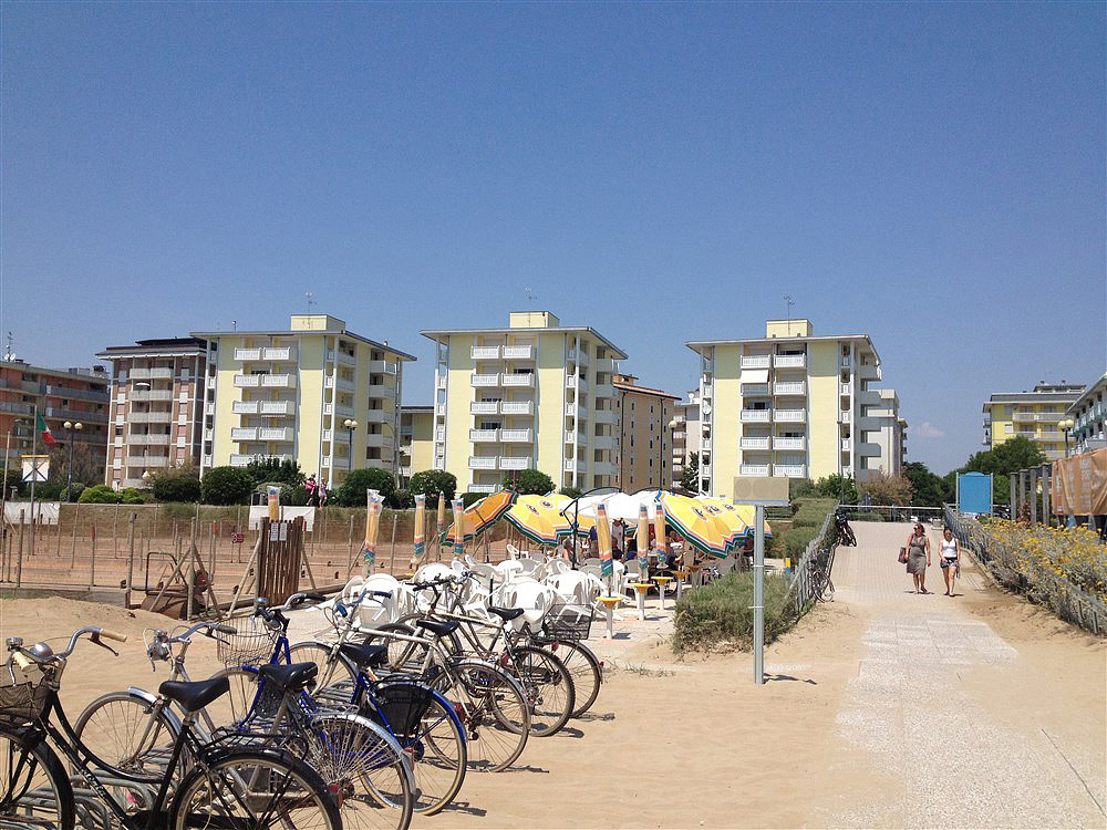 plážový servis sestává ze slunečníku, lehátka a plážového křesla či slunečníku a 2 lehátek ; nabízen je na převážné většině pláží v Bibione