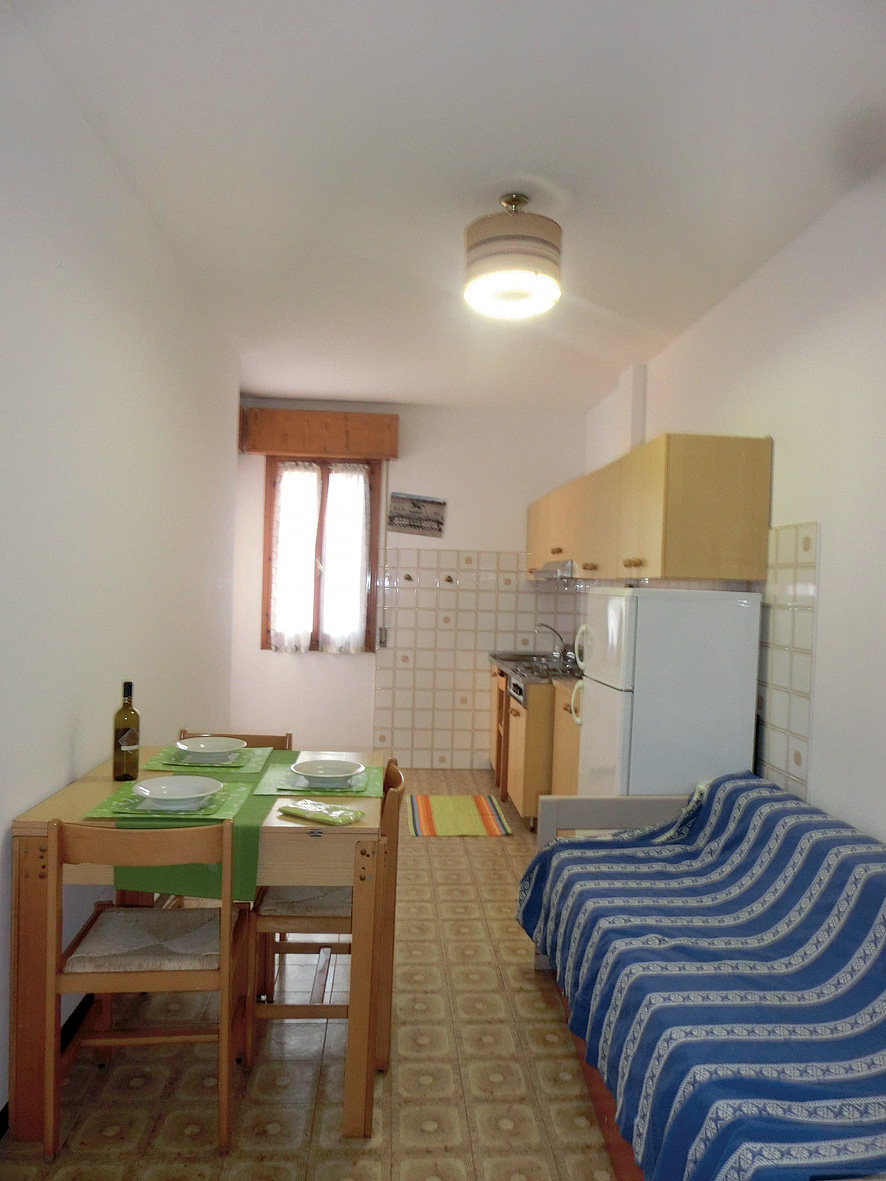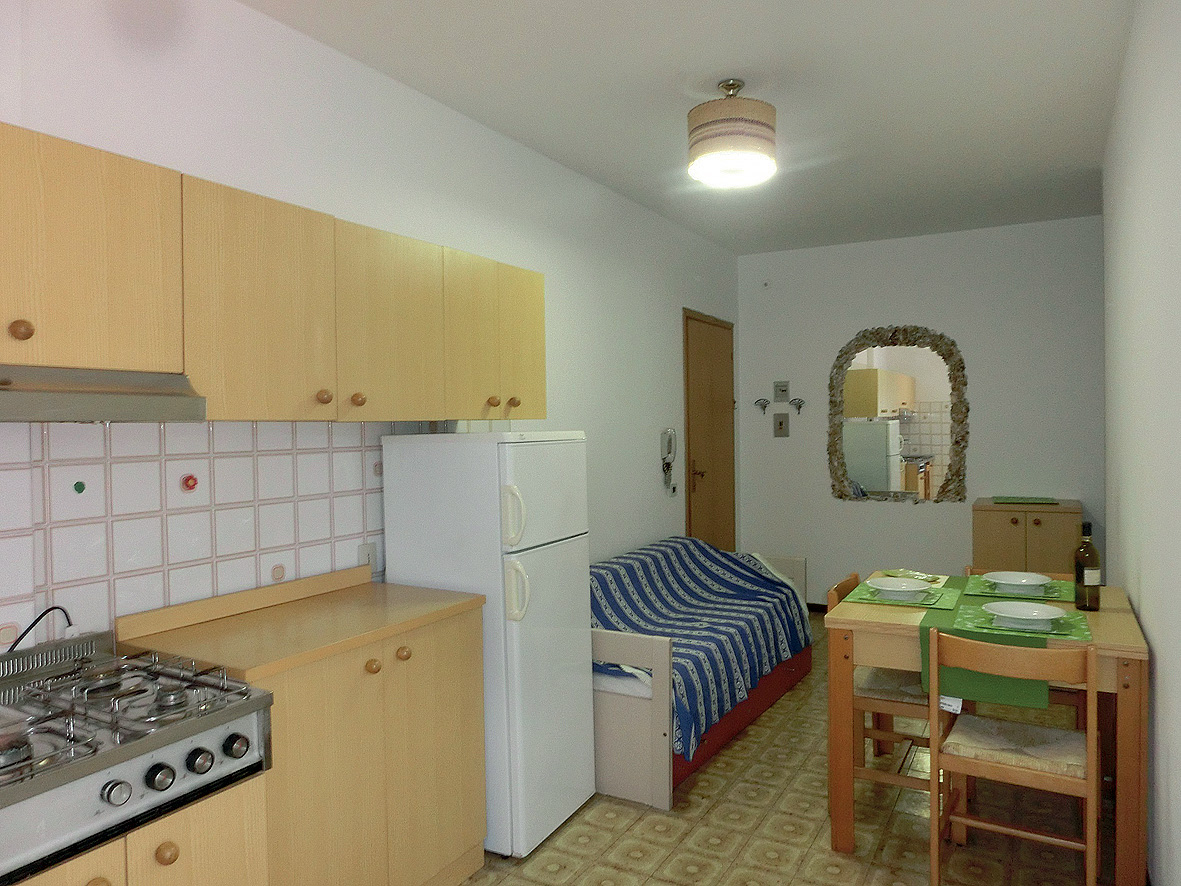 mono 2/3 - 20 až 25 m² - obývací pokoj s kuchyňským koutem, rozkládacím gaučem (možnost typ "šuplík") pro 2 osoby či palandou (možnost jen u mono 3) a případně 1 samostatným lůžkem, sociální zařízení se sprchou, balkon