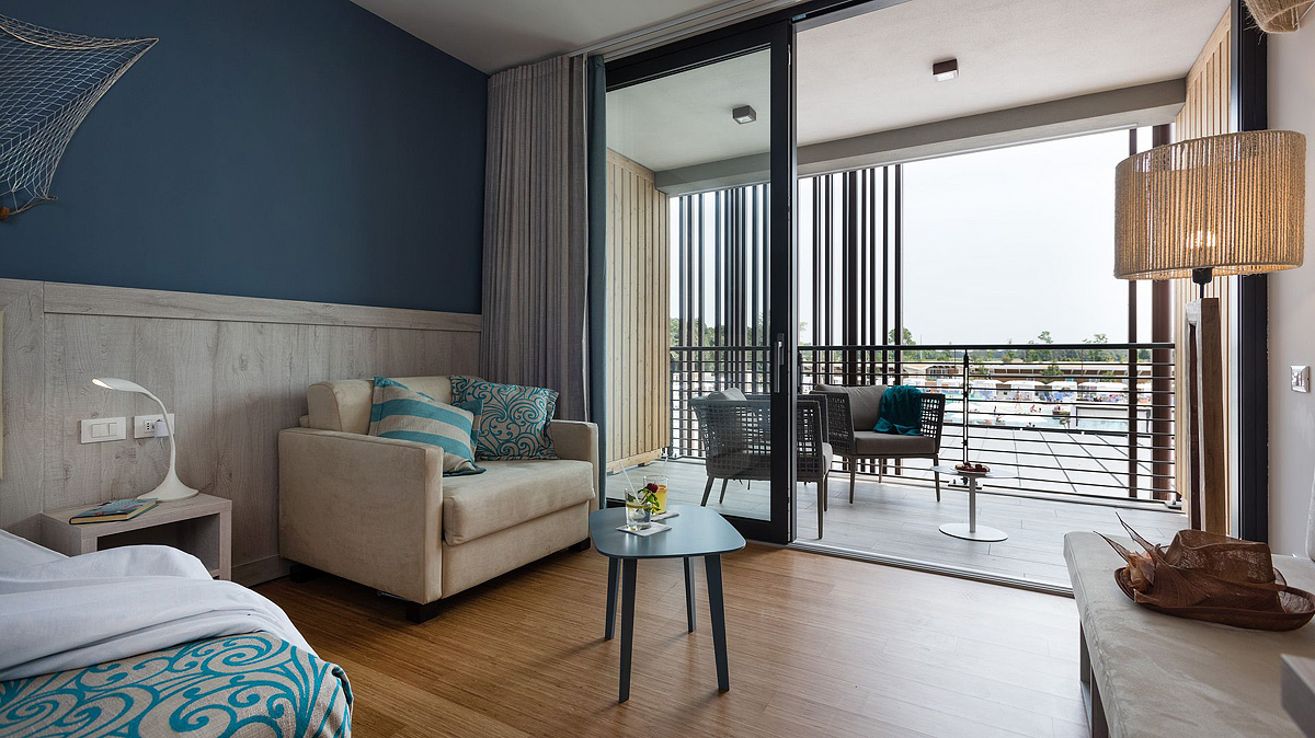 29 m² - 1 ložnice s manželskou postelí a obývací pokoj s rozkládacím křeslem, sociální zařízení se sprchou, balkon s výhledem na bazén a zahradu