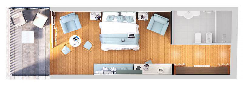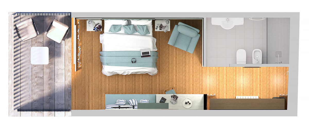 69 m² - 1 ložnice s manželskou postelí, 1 ložnice se 2 samostatnými lůžky, obývací pokoj s rozkládacím gaučem pro 2 osoby, vybavený kuchyňský kout, 2x sociální zařízení se sprchou, panoramatická sluneční terasa