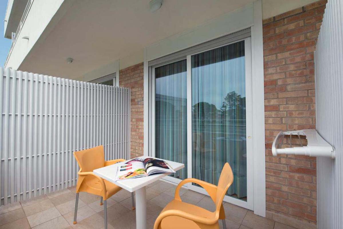 19 m² – pokoj s manželskou postelí či dvěma samostatnými lůžky, sociální zařízení se sprchovým boxem, balkon; 3. lůžko řešeno formou přistýlky