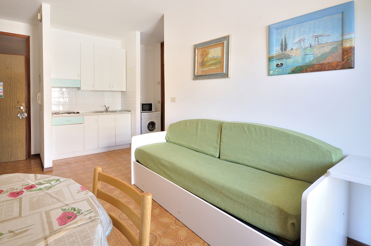 25 m² - obývací pokoj s kuchyňským koutem, rozkládacím gaučem (možnost typ "šuplík") pro 2 osoby a rozkládací křeslo či pohovka pro 1 osobu, sociální zařízení zpravidla se sprchovým boxem, balkon