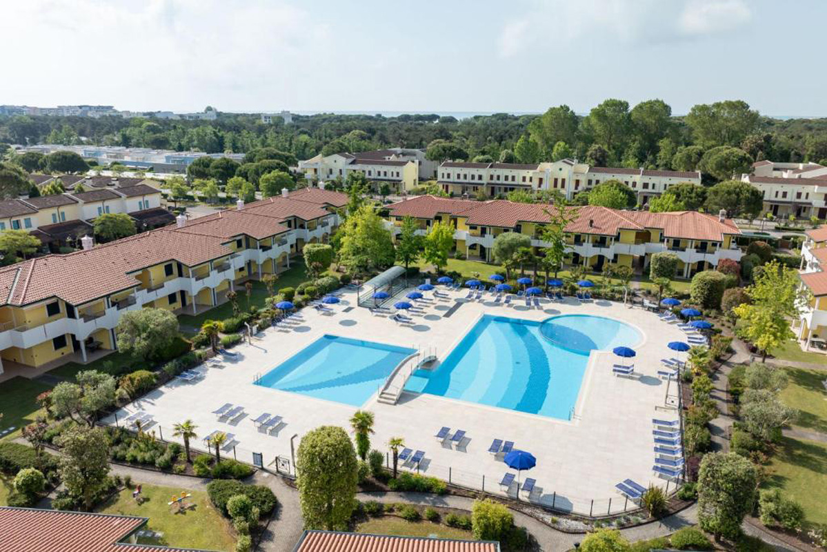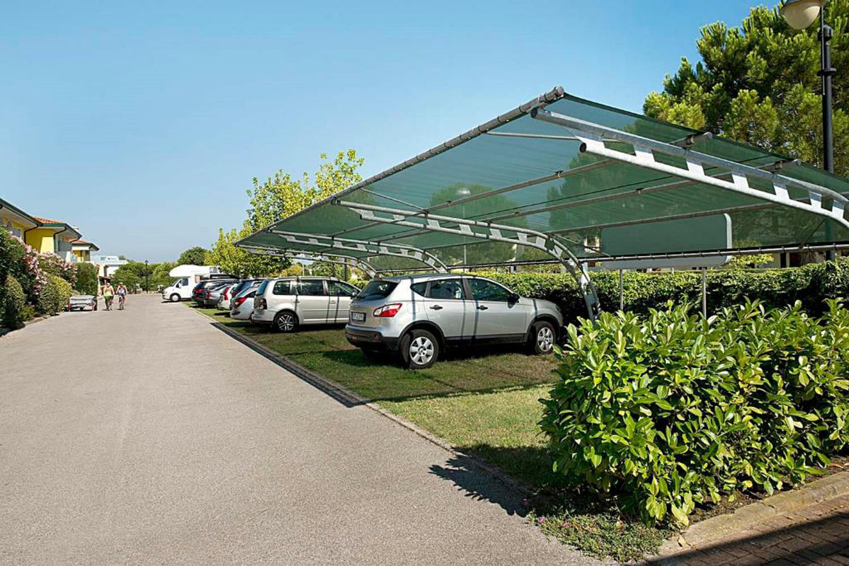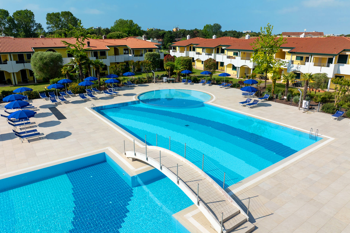 velký bazén atypického tvaru s lehátky a slunečníky, dětský bazének, dětské hřiště, 1 vyhrazené kryté parkovací stání / apartmán, vyhrazené parkoviště