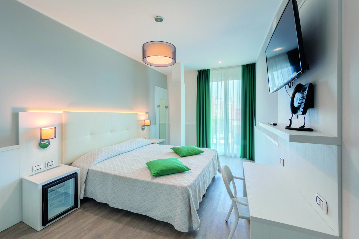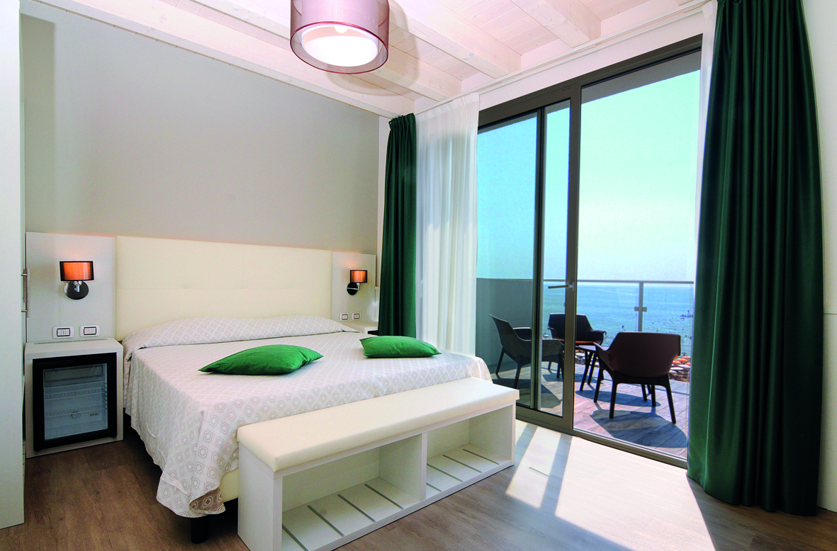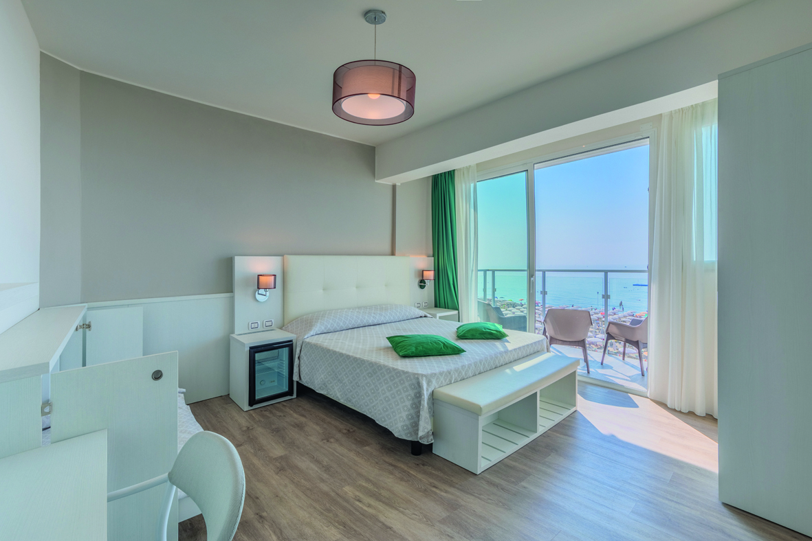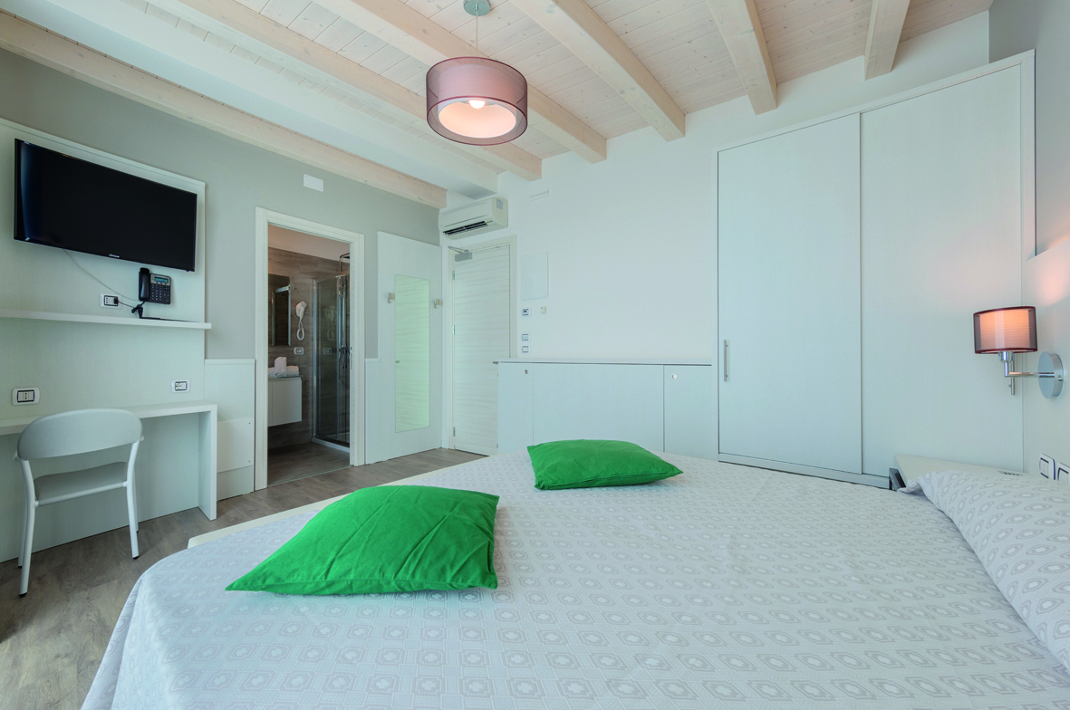 pokoj s manželskou postelí či 2 samostatnými lůžky, sociální zařízení se sprchou, balkon s bočním výhledem na moře; možnost 3. a 4. lůžka; čtyřlůžkové pokoje s palandou