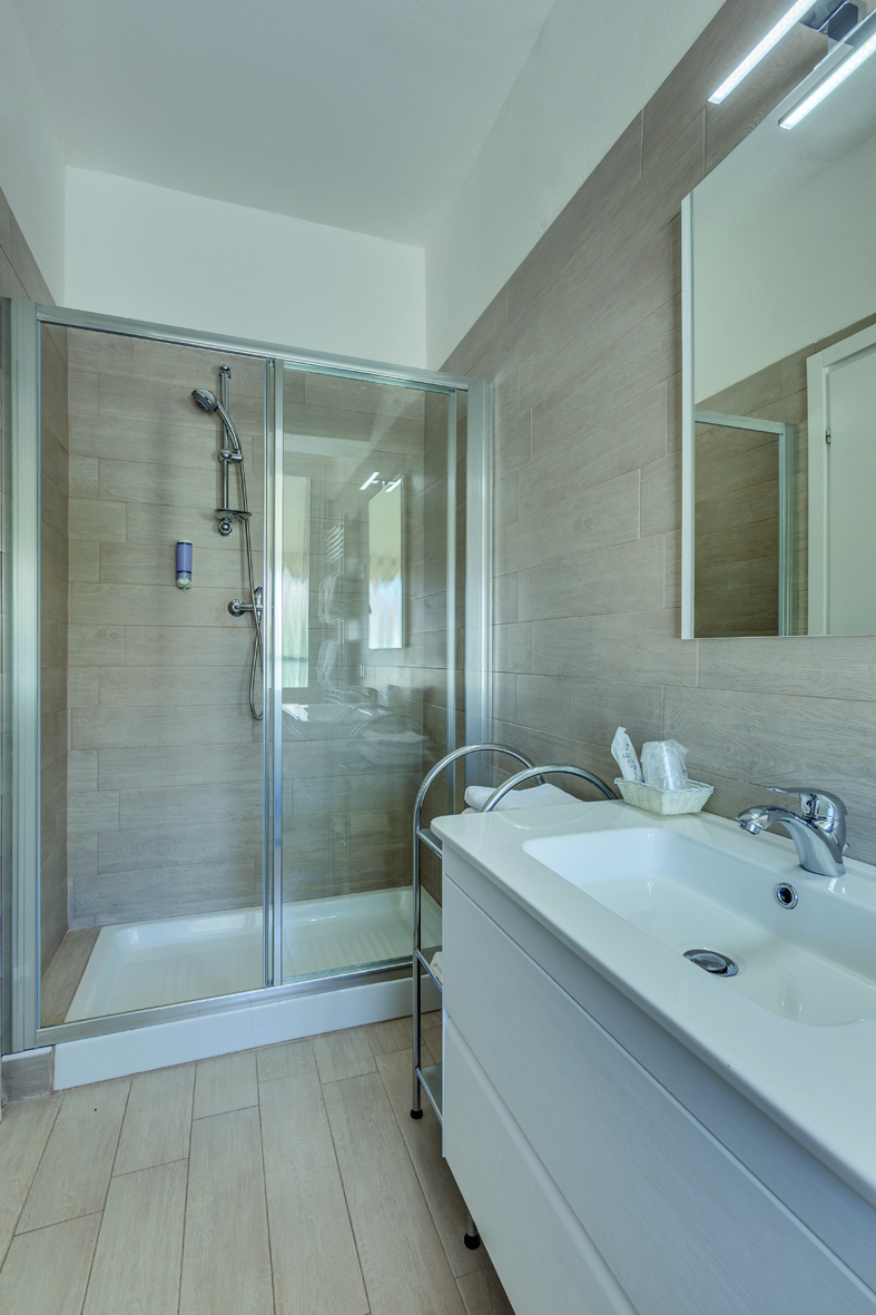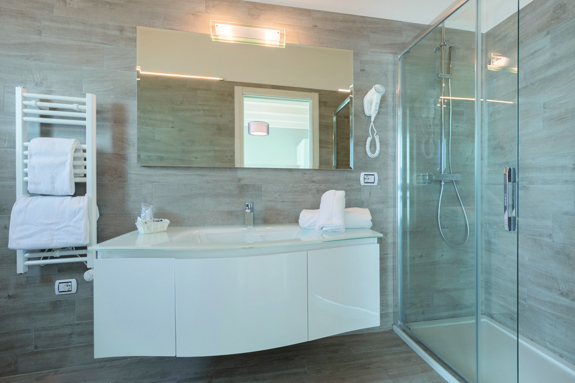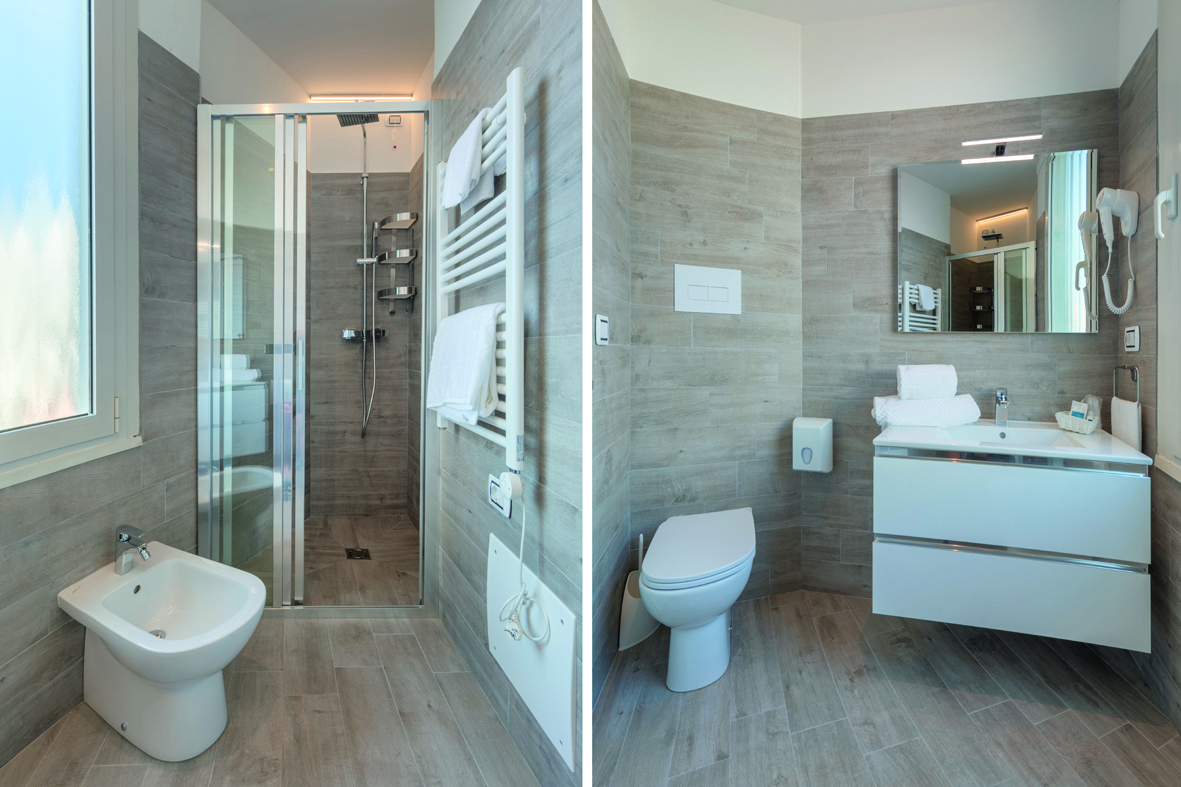 pokoj s manželskou postelí či 2 samostatnými lůžky, sociální zařízení se sprchou, balkon s bočním výhledem na moře; možnost 3. a 4. lůžka; čtyřlůžkové pokoje s palandou