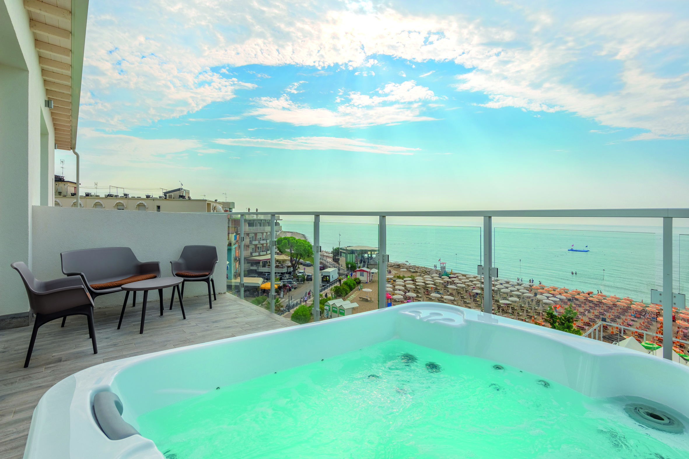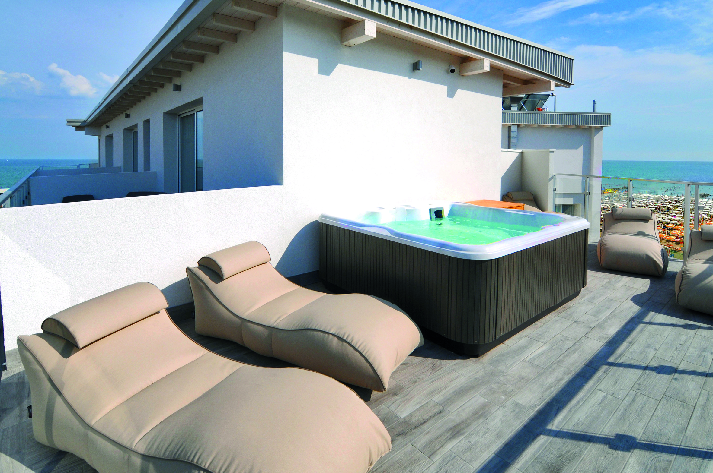 sluneční střešní terasa s whirlpoolem, plážový servis (1 slunečník, 2 lehátka / pokoj) v ceně, půjčovna jízdních kol