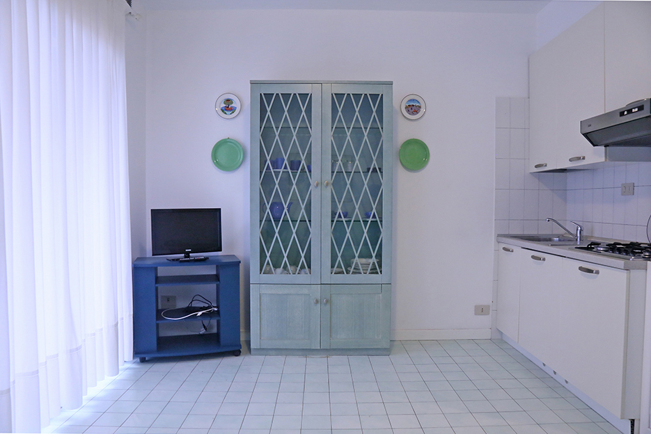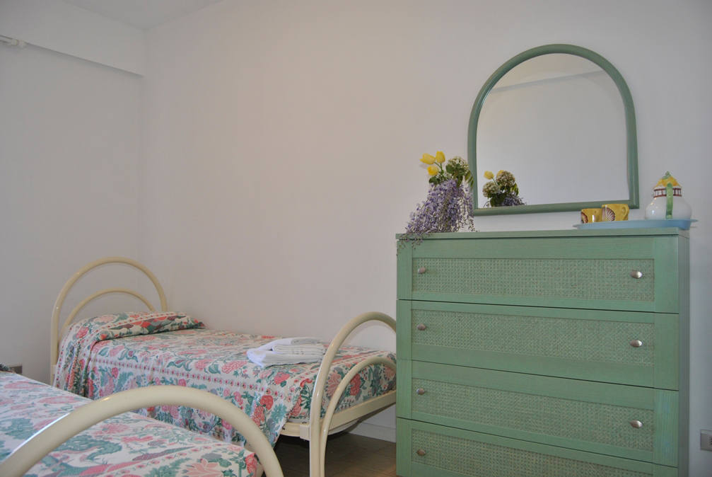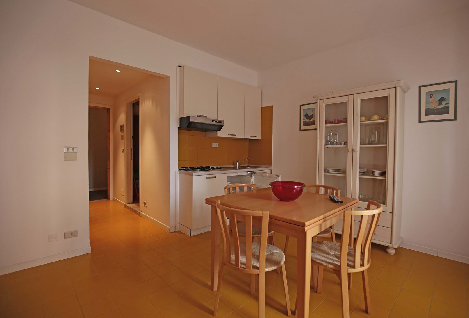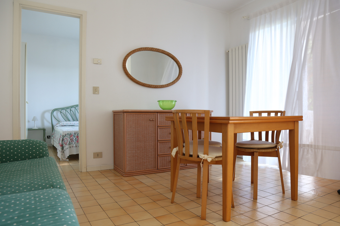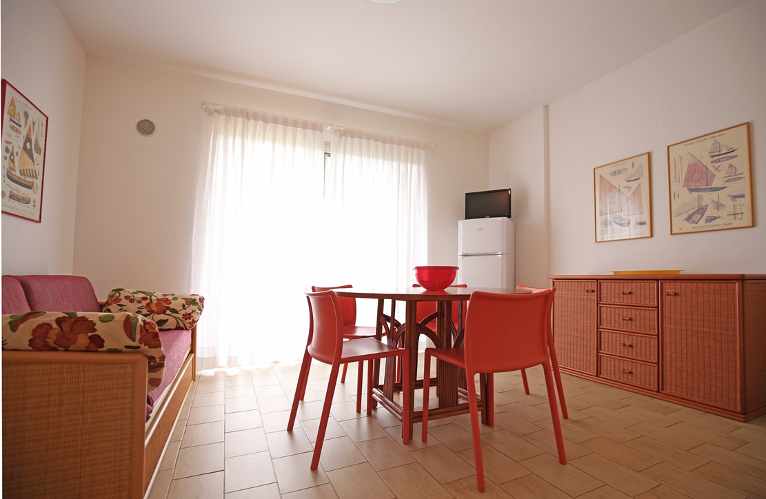 50 m² - 1. či 2. patro: 1 ložnice s manželskou postelí, 1 ložnice se 2 samostatnými lůžky, menší balkon, obývací pokoj s kuchyňským koutem a rozkládacím gaučem typu "šuplík" pro 2 osoby, sociální zařízení s vanou či sprchovým koutem, velký balkon s výhledem na bazén u typu označeném trilo 6 - bazén