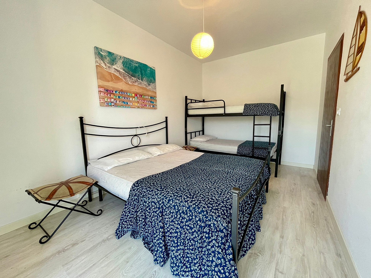 ložnice s manželskou postelí a jedním samostatným lůžkem, obývací pokoj s kuchyňským koutem a dvěma gauči, sociální zařízení se sprchou, balkon, bilo 5° s pračkou a troubou