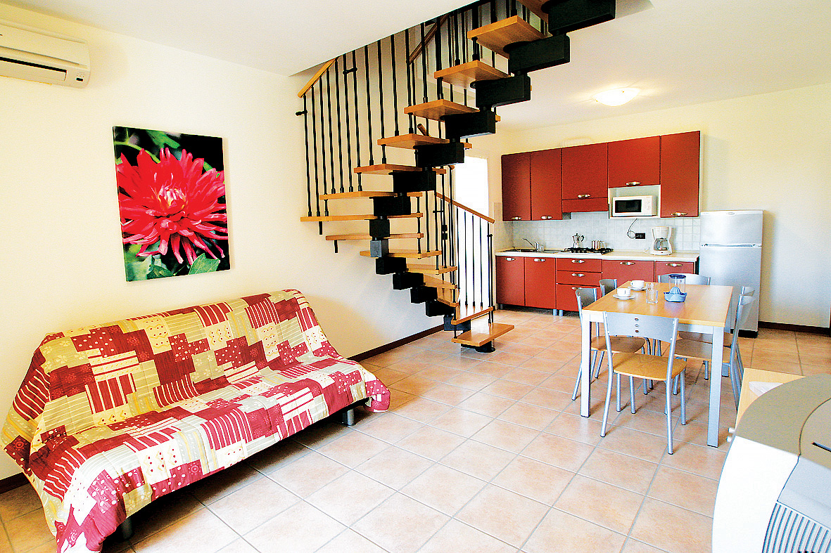 44 m² - přízemí: obývací pokoj s kuchyňským koutem a rozkládacím gaučem pro 2 osoby, terasa a předzahrádka; 1. patro: 1 ložnice s manželskou postelí a 1 samostatným lůžkem, sociální zařízení se sprchou, balkon