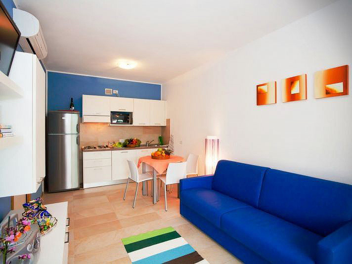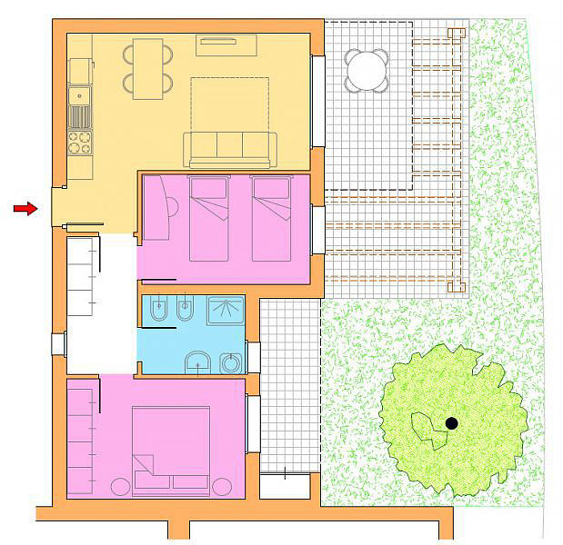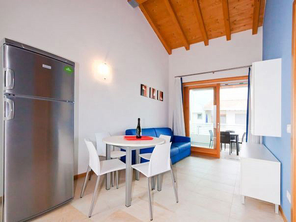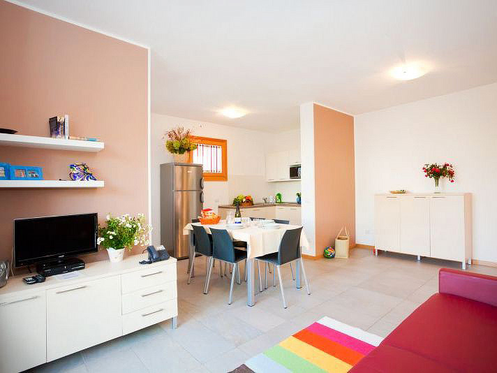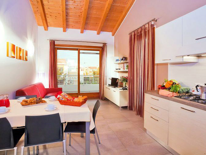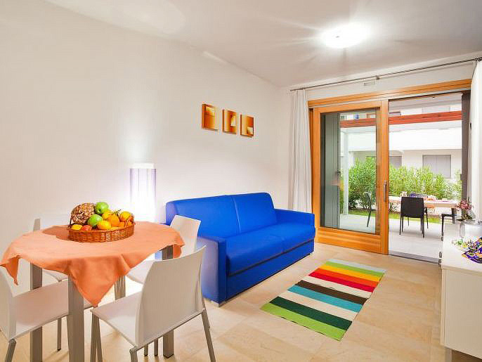 65 m² - 1 ložnice s manželskou postelí, 1 ložnice se 2 samostatnými lůžky, obývací pokoj s kuchyňským koutem a rozkládacím gaučem pro 2 osoby, sociální zařízení se sprchovým boxem, balkon, apartmány v přízemí mají terasu s předzahrádkou