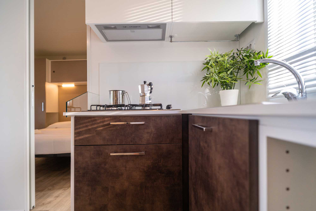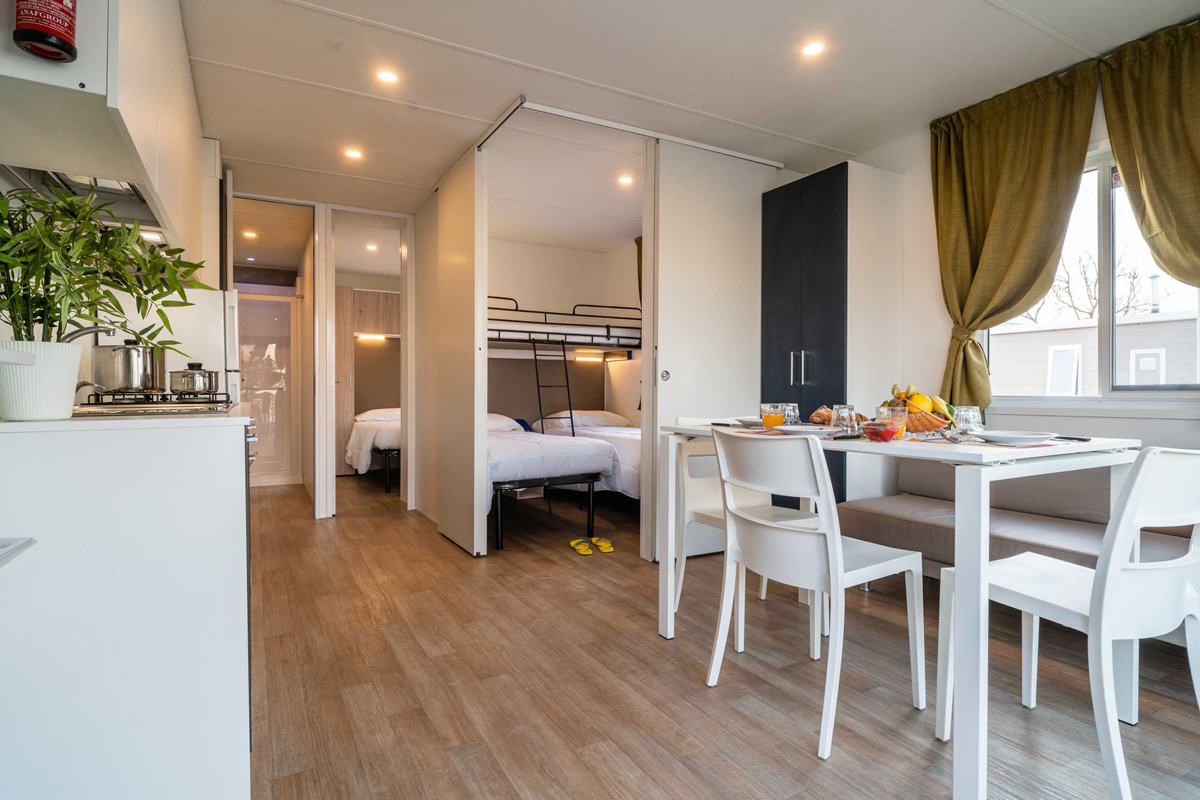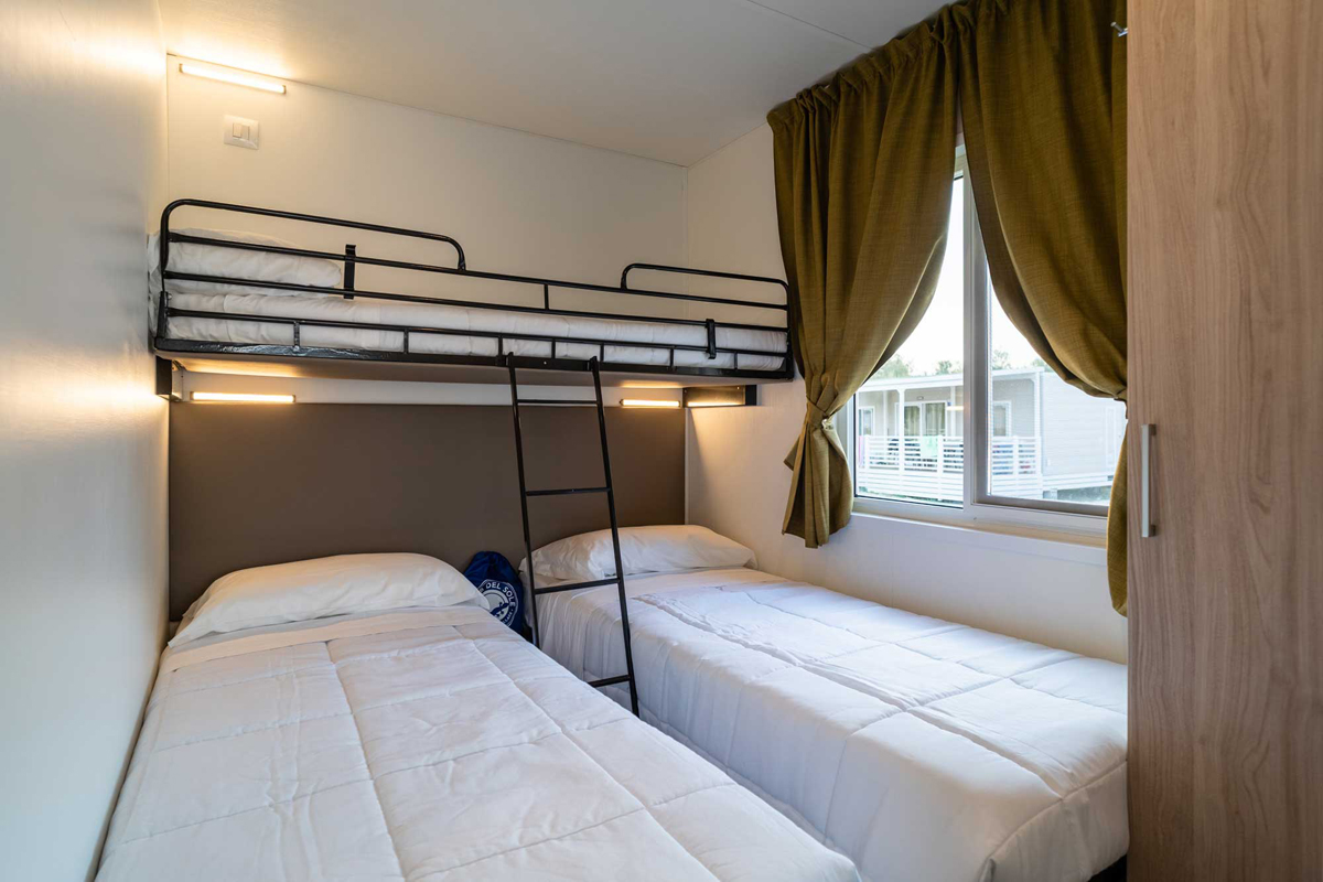 32 m² - 1 ložnice s manželskou postelí, 1 ložnice se 2 samostatnými lůžky a 1 zavěšeným lůžkem pro dítě do 9,99 let, obytná část s kuchyňským koutem, 2 sociální zařízení se sprchou, krytá uzavřená dřevěná terasa