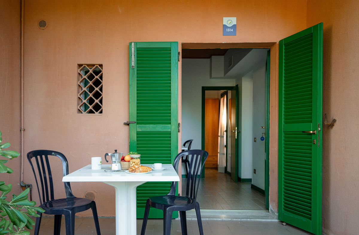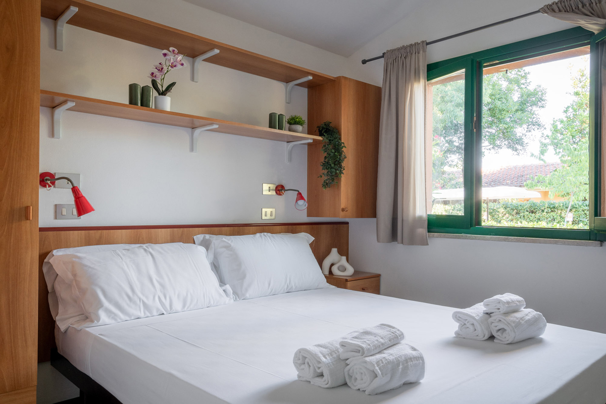 42 m² - 1 ložnice s manželskou postelí, 1 ložnice se 2 samostatnými lůžky, obývací pokoj s kuchyňským koutem, sociální zařízení se sprchou, veranda
