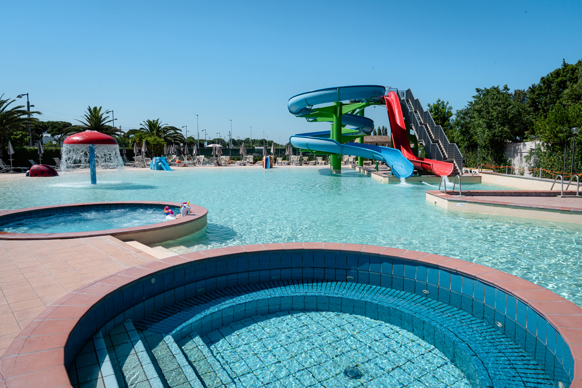1 bazén s pozvolným vstupem, dětskou částí a tobogány, 2 vířivky, plavecký bazén, lehátka* a slunečníky*, stolní tenis, multifunkční hřiště, tenisový kurt, fotbalové hřiště, pickeballové hřiště, půjčovna kol*