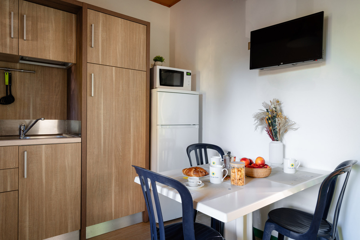 32 m² - 1 ložnice s manželskou postelí, 1 ložnice se 2 samostatnými lůžky a 1 zavěšeným lůžkem pro dítě do 9,99 let, obytná část s kuchyňským koutem, sociální zařízení se sprchou, krytá dřevěná terasa