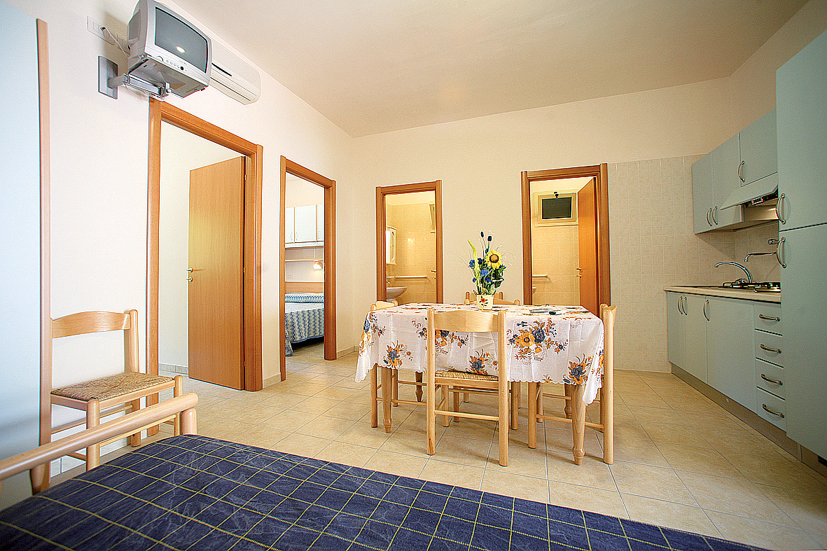 recepce, restaurace / pizzerie / vnitřní a venkovní bar, společenská místnost s TV sat., animační programy (přibližně od poloviny června do poloviny září), 1 vyhrazené parkovací stání / apartmán (další parkovací místo*), pračka, barbecue, wi-fi připojení k internetu