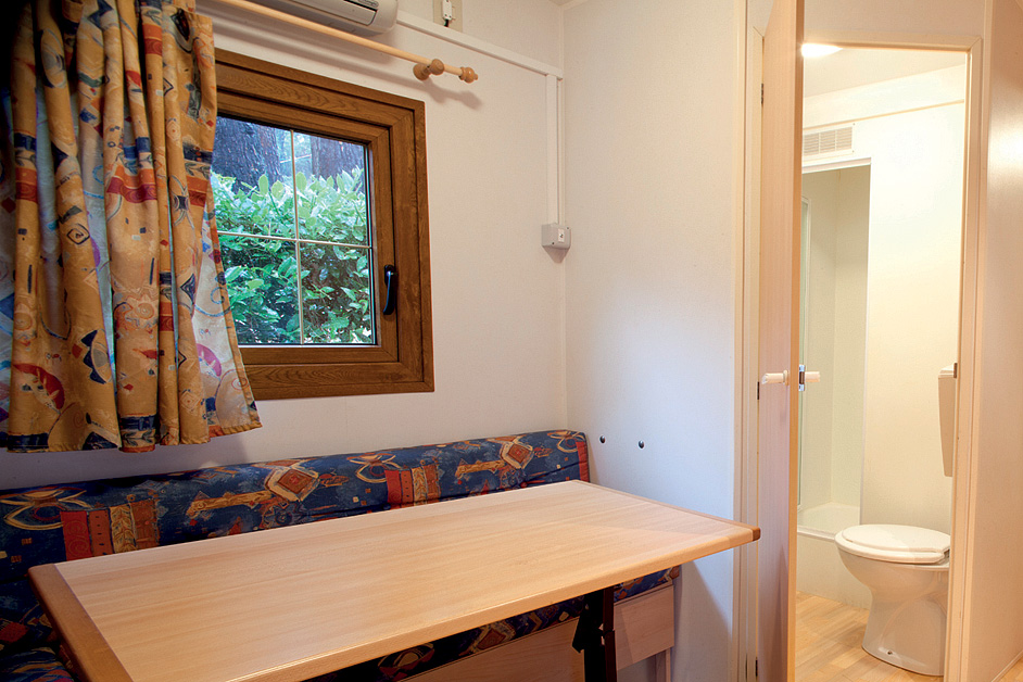 24 m² - 1 ložnice s manželskou postelí, 1 ložnice se 2 samostatnými lůžky a 1 zavěšeným lůžkem (pro dítě do 150 cm a 60 kg), obývací pokoj s kuchyňským koutem a lavicí rozložitelnou na lůžko, sociální zařízení se sprchou, samostatné WC, krytá terasa se zahradním nábytkem; maximální obsazenost jsou 4 dospělí a 2 děti do nedovršených 12 let