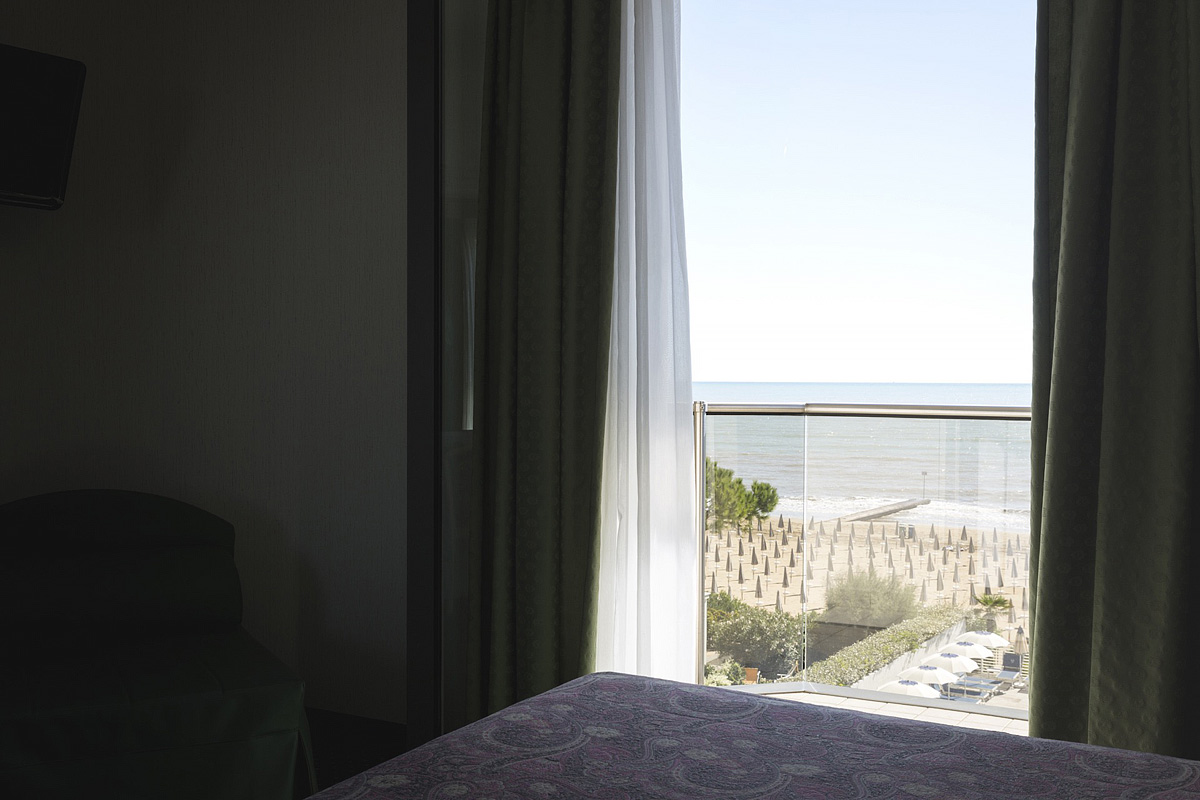 pokoj s manželskou postelí či se 2 oddělitelnými lůžky, sociální zařízení se sprchou, balkon s bočním výhledem na moře, 3. lůžko formou pevného lůžka či přistýlky
