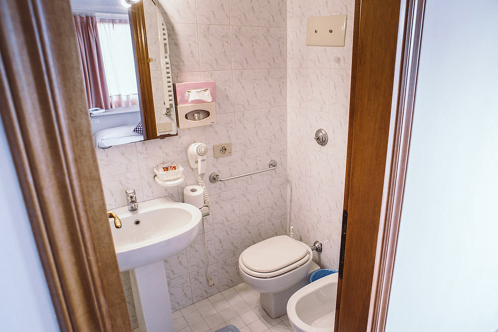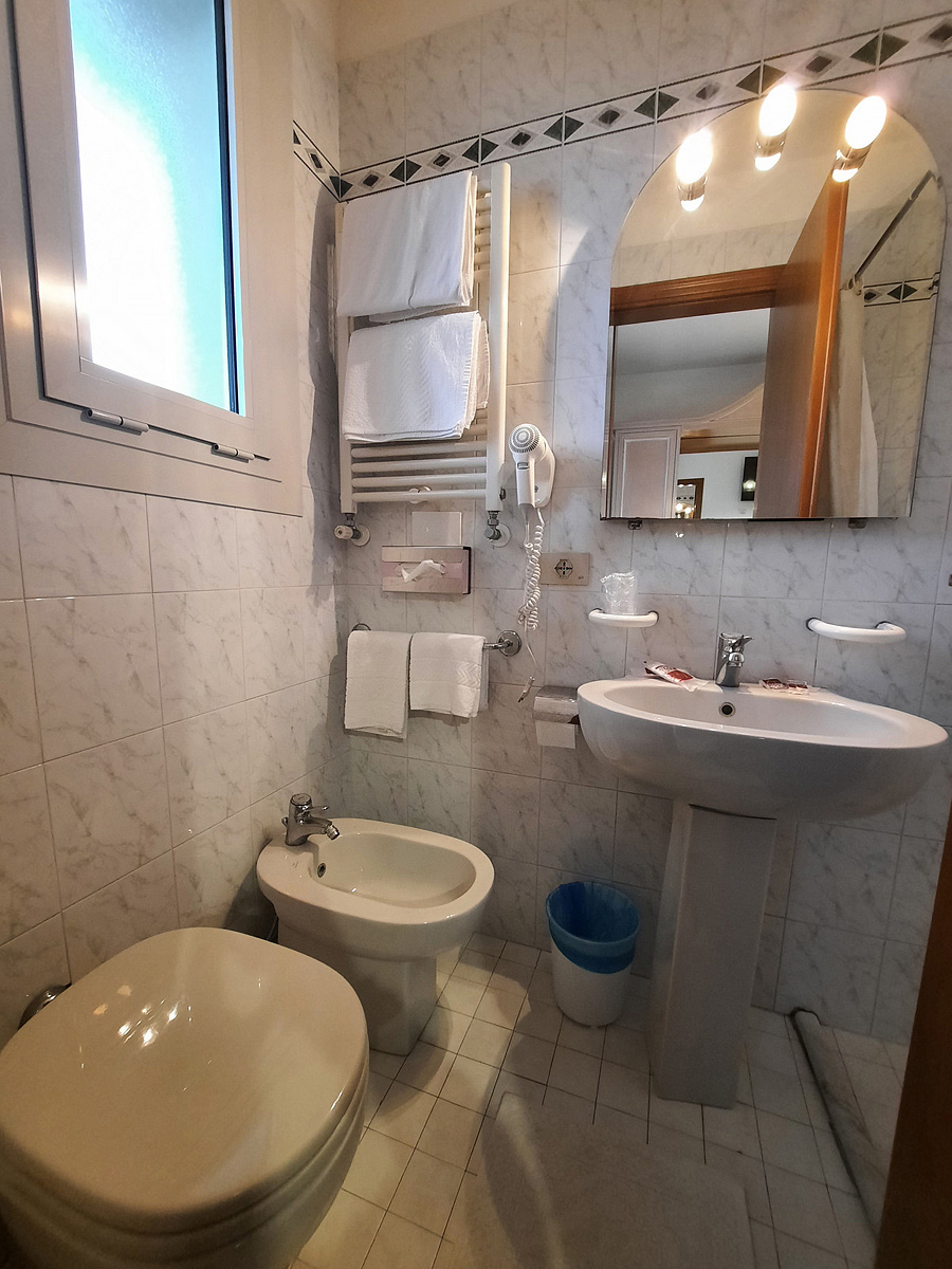 pokoj s manželskou postelí či 2 samostatnými lůžky, sociální zařízení se sprchou, balkon