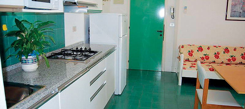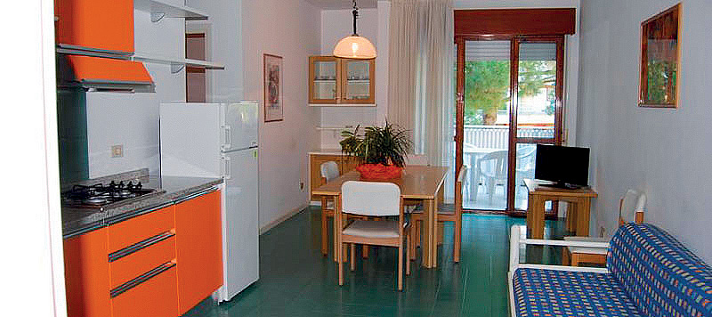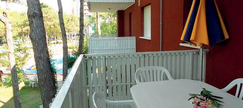 bilo 4/5 rosso - 50 až 54 m² - dvoupodlažní apartmán - nižší patro: obývací pokoj s rozkládacím gaučem pro 2 osoby (možno i typ "šuplík"), kuchyňka, sociální zařízení se sprchou, balkon s výhledem do zahrady; vyšší patro: 1 ložnice s manželskou postelí a případně 1 samostatným lůžkem, sociální zařízení se sprchovým boxem, balkon