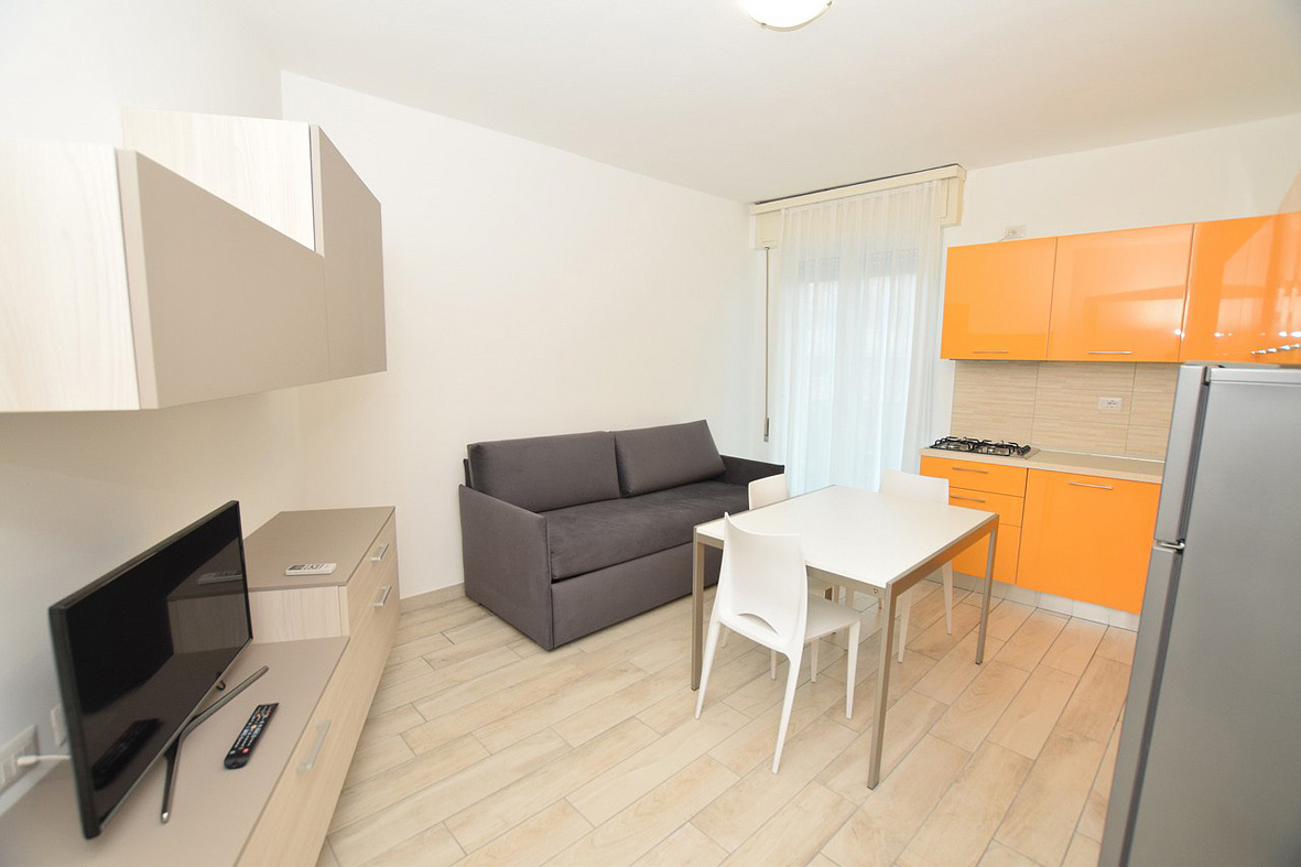 50 m² - 1 ložnice s manželskou postelí a 1 samostatným lůžkem, obývací pokoj s kuchyňským koutem a rozkládacím gaučem pro 2 osoby, sociální zařízení se sprchovým koutem, menší balkon; u typu bilo 5M – balkon s přímým či bočním výhledem na moře